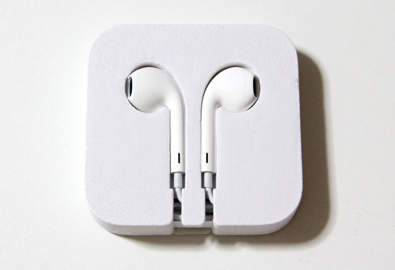 付属のイヤホンは、Appleが新しく設計した「EarPods(イヤーポッズ)」です。従来の丸型イヤホンとは異なり、耳の形状に合わせてフィットするようデザインされています。