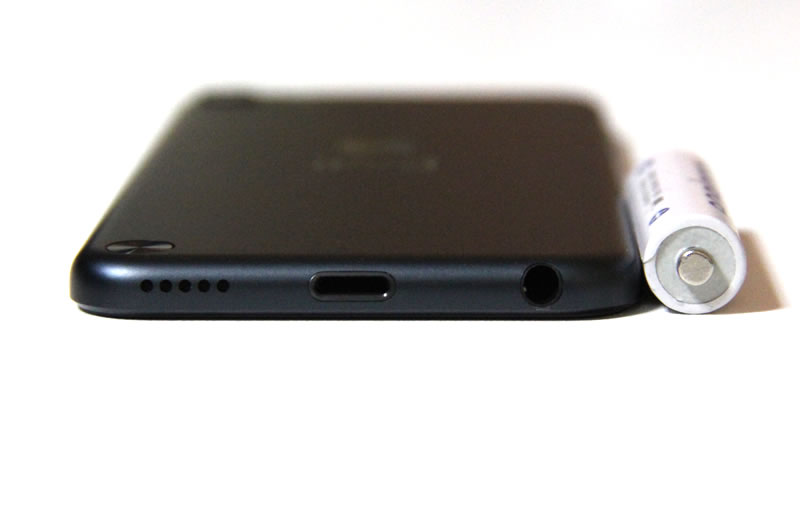 比較用に単三電池を並べてみました。こうして見ると、本体の薄さがよく分かります。ボディ下部には、左からスピーカー、Lightningコネクタ、イヤホンジャックが配置されています。