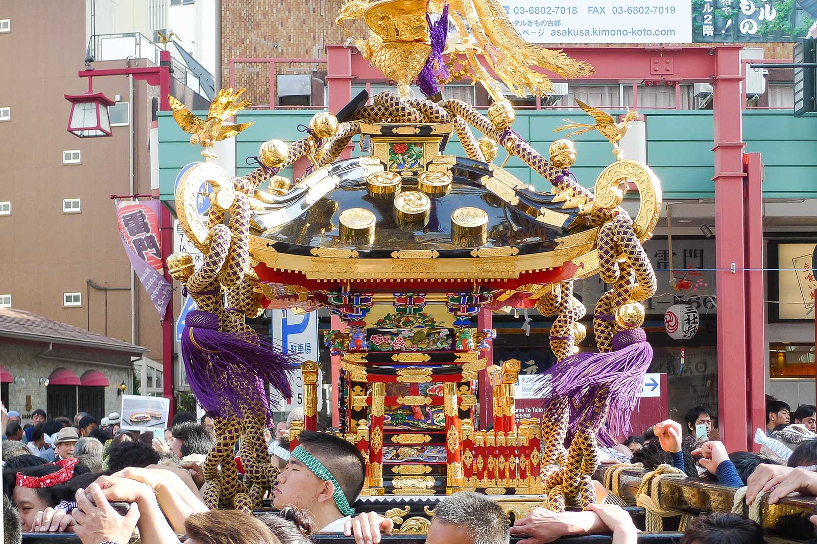 金色に輝く装飾が太陽の光を受けてまぶしく、担ぎ手たちの法被が一斉に揺れます。笑顔や気合いのこもった表情が入り混じり、浅草の通り全体が活気に包まれます。