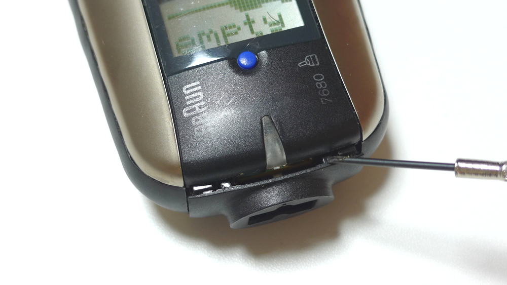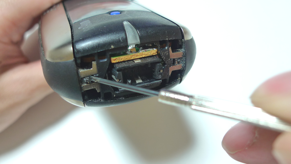 充電端子の左右と上下、計4か所に爪があるため、細いマイナスドライバーで開けていきます。