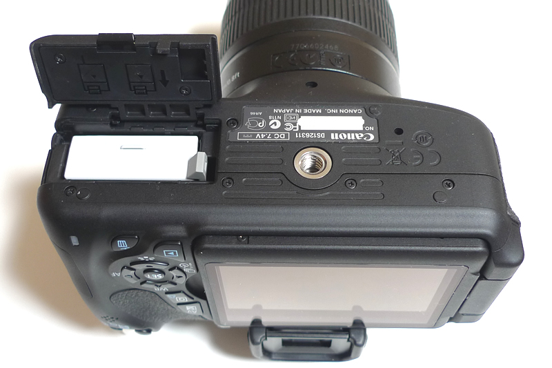 底面のバッテリー収納。中央には三脚ネジ穴を備え、設置時の安定性もしっかりしています。