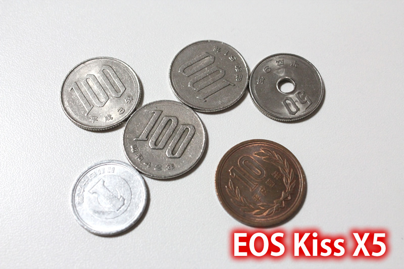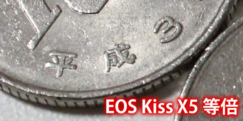 EOS Kiss X5で撮影した硬貨の等倍。金属の質感や文字のエッジまでくっきりしています。