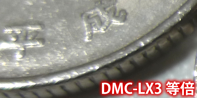 こちらはDMC-LX3で撮った同じ硬貨。こちらカメラの方が寄れるため大きく写りますが、解像感はEOS Kiss X5が上ですね。