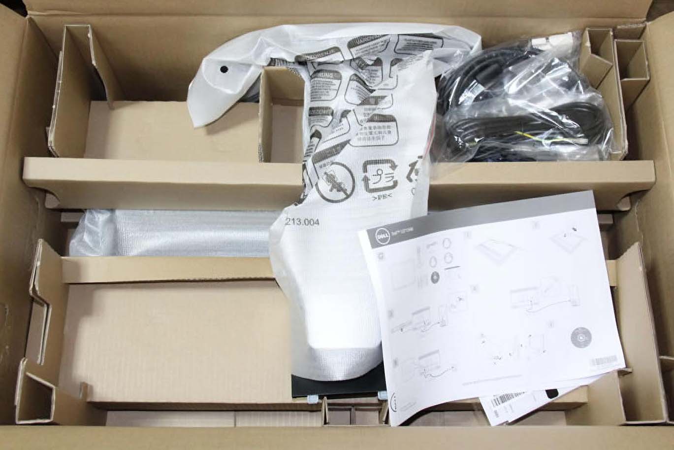 箱を開けたところ。スタンド部分と付録のケーブル類が見えます。梱包材はすべて紙素材で環境にやさしい構成になっています。組み立て説明書もわかりやすく同梱されています。