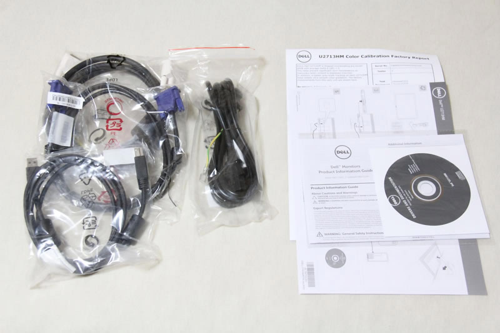 同梱物一覧です。電源ケーブル、DVI、VGA、USBケーブルのほか、ドライバディスクや色補正完了報告書がセットになっています。必要なケーブルが一式そろっているのがうれしいところです。