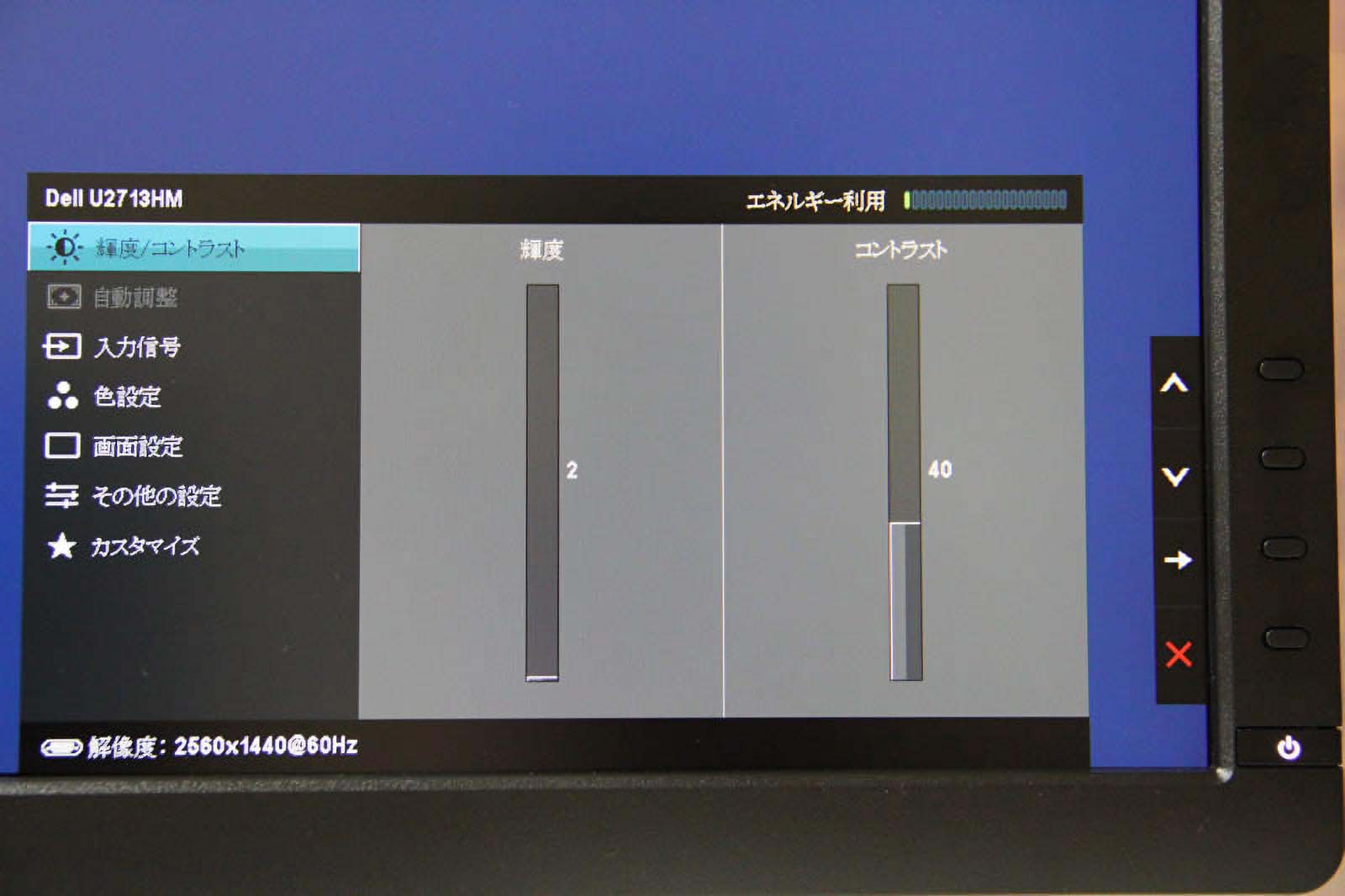 輝度・コントラストの設定画面(OSD)を表示した状態です。個別に細かく調整できるため、使用環境や好みに合わせて最適な明るさを設定できます。
