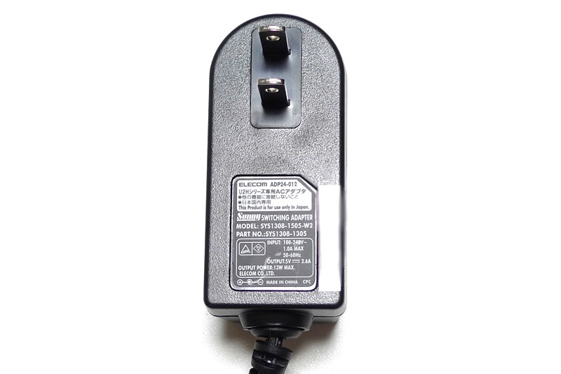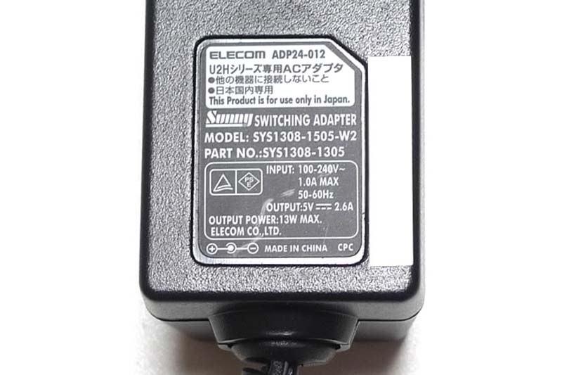 アダプターのラベル部分。入力は100〜240V対応、出力は5V・2.6A(最大13W)。USB機器を複数接続しても安定して電力を供給できます。