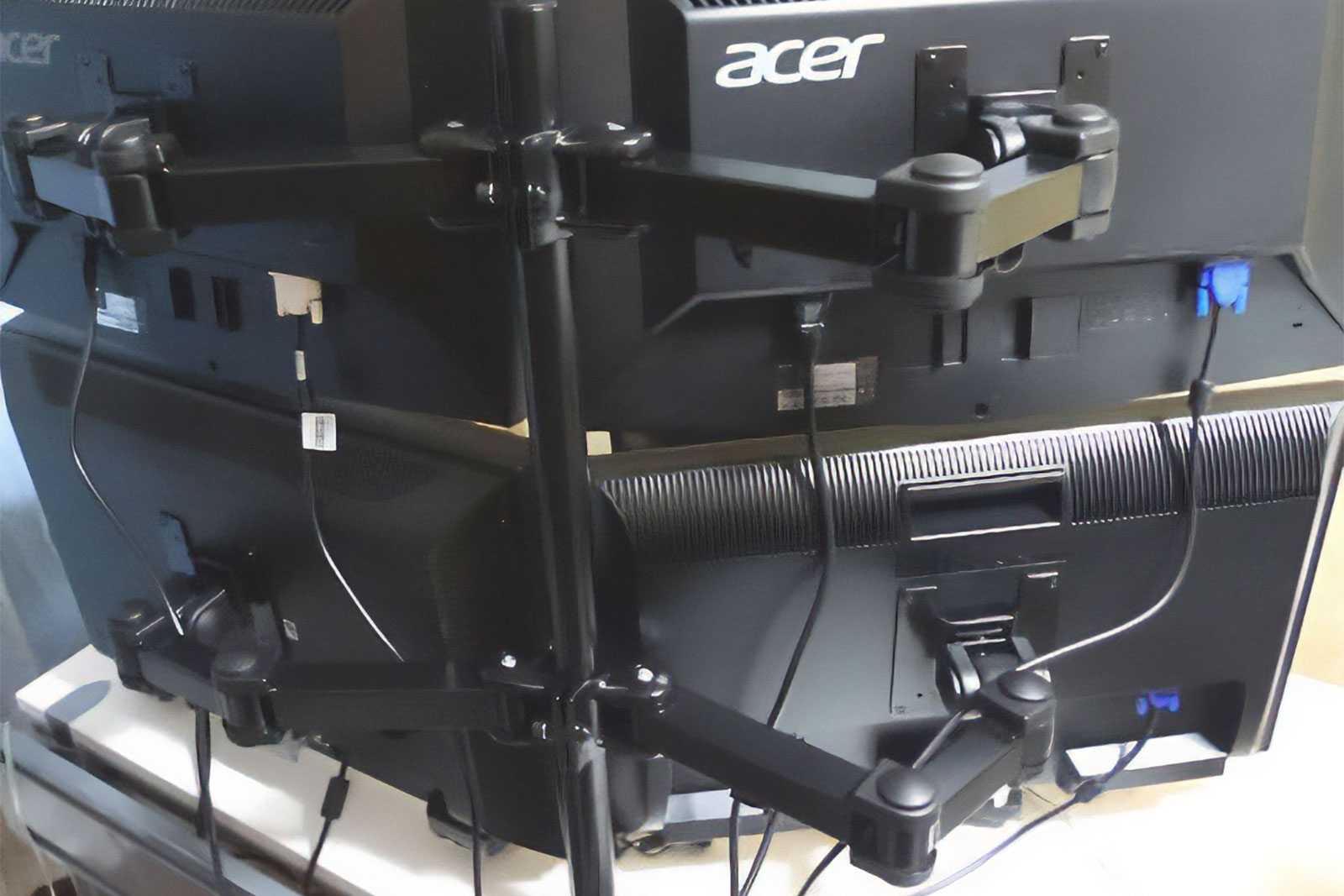 これで4台のモニター設置が完了しました。背面から見ると、このように上下2段でしっかりと固定されています。このあと、配線をまとめて固定し、見た目もすっきりと仕上げていきます。