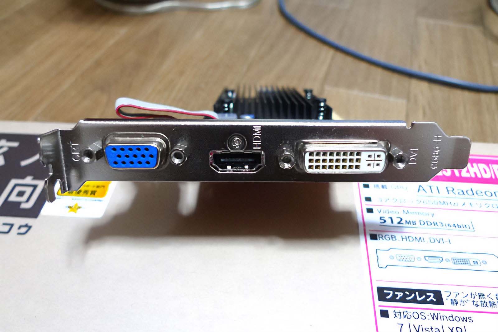 ビデオカードには、VGA(アナログ)・HDMI・DVI-I の3つの映像出力端子が備わっています。複数の出力方式に対応しているため、古いモニターと新しいモニターを混在させても問題ありません。