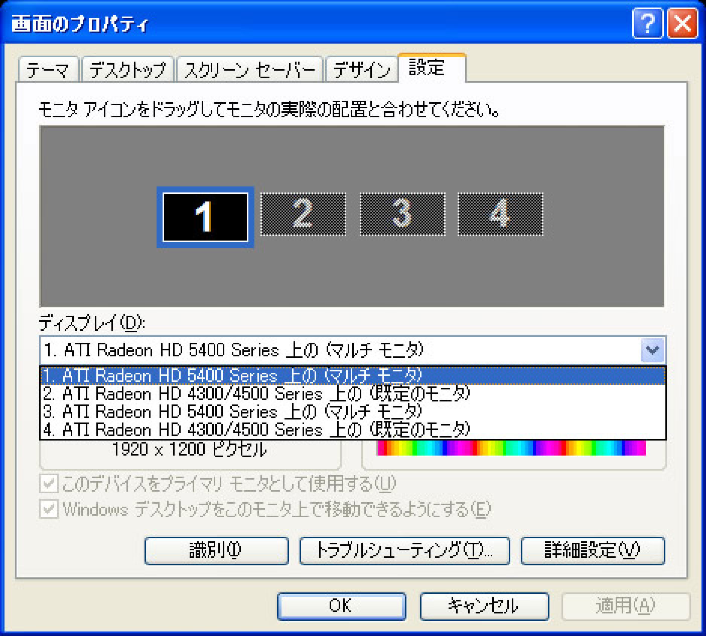 すべての接続が完了したら、Windows上でモニターの設定を行います。「画面のプロパティ」からモニターの配置を実際のレイアウトに合わせてドラッグし番号を調整します。