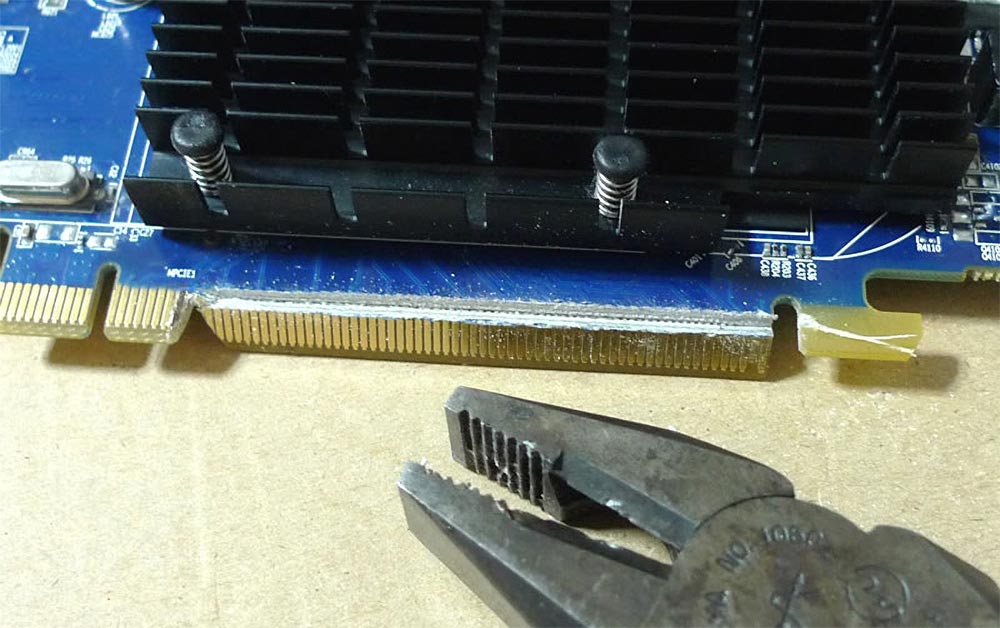 x1スロットで使えるようにするため、PCIe x16コネクタの不要な接続ピン部分をカットして短くします。写真のように、必要な端子だけを残して物理的に幅を合わせる加工です。