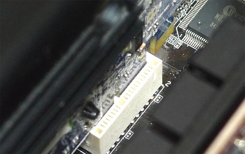 カッターを使い、PCIeコネクタ上部の樹脂部分を少しずつ削っていきます。一度で切ろうとせず、何回も往復させながらゆっくりと溝を深くします。