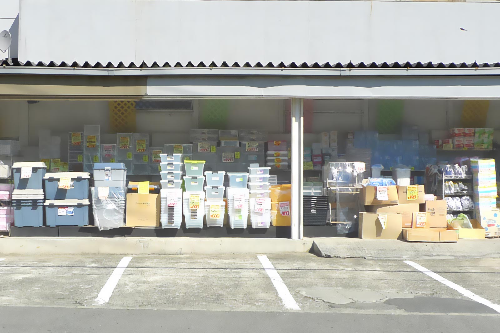 店先には、工具箱や押し入れ用の収納ボックス、植木鉢、ガーデニング・園芸用品などが並んでいます。