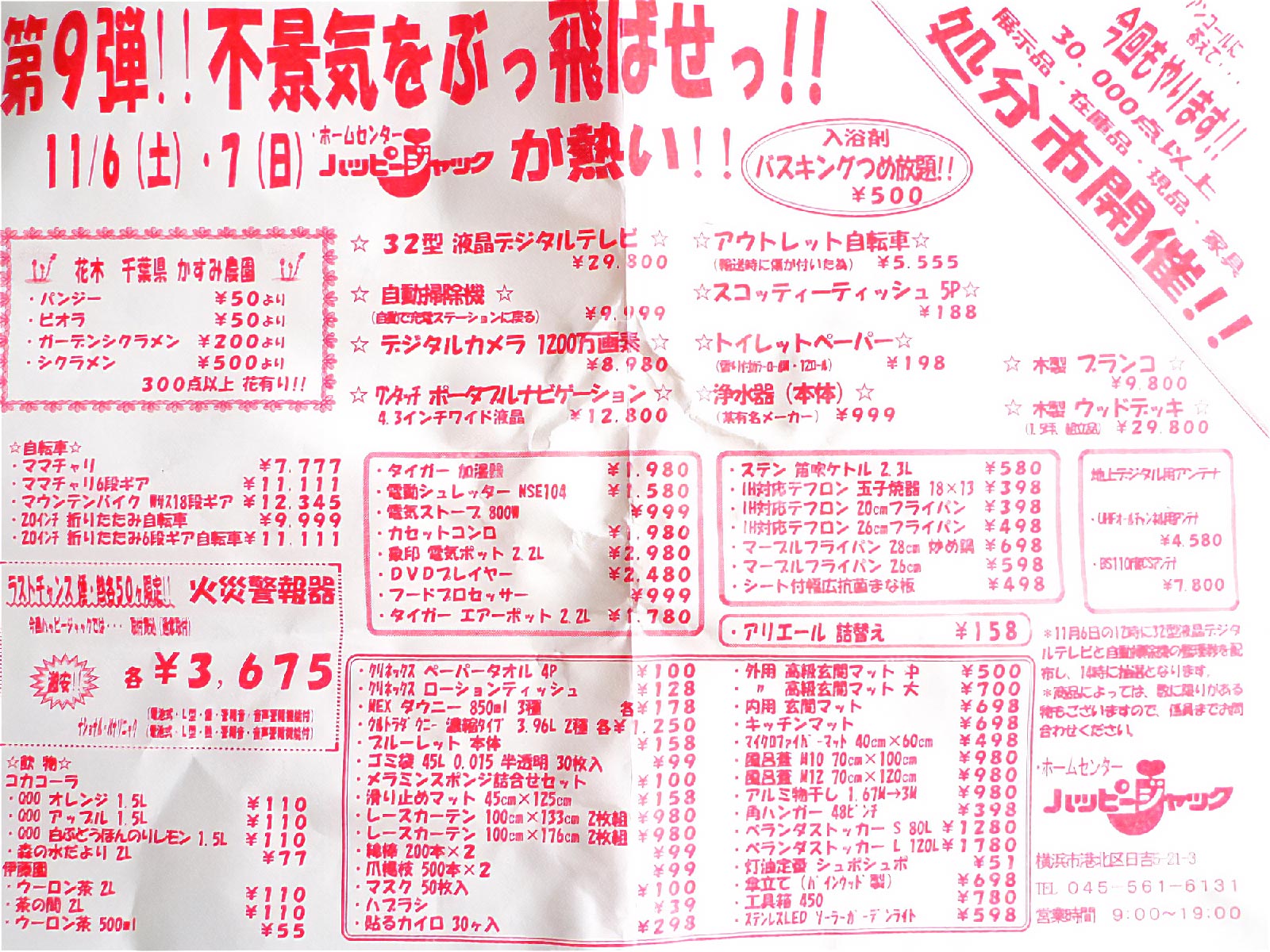 ハッピージャックのチラシが久しぶりにポストに入っていました。火災報知器や飲み物が特価で販売されており、セール時はいつも多くの人で賑わいます。