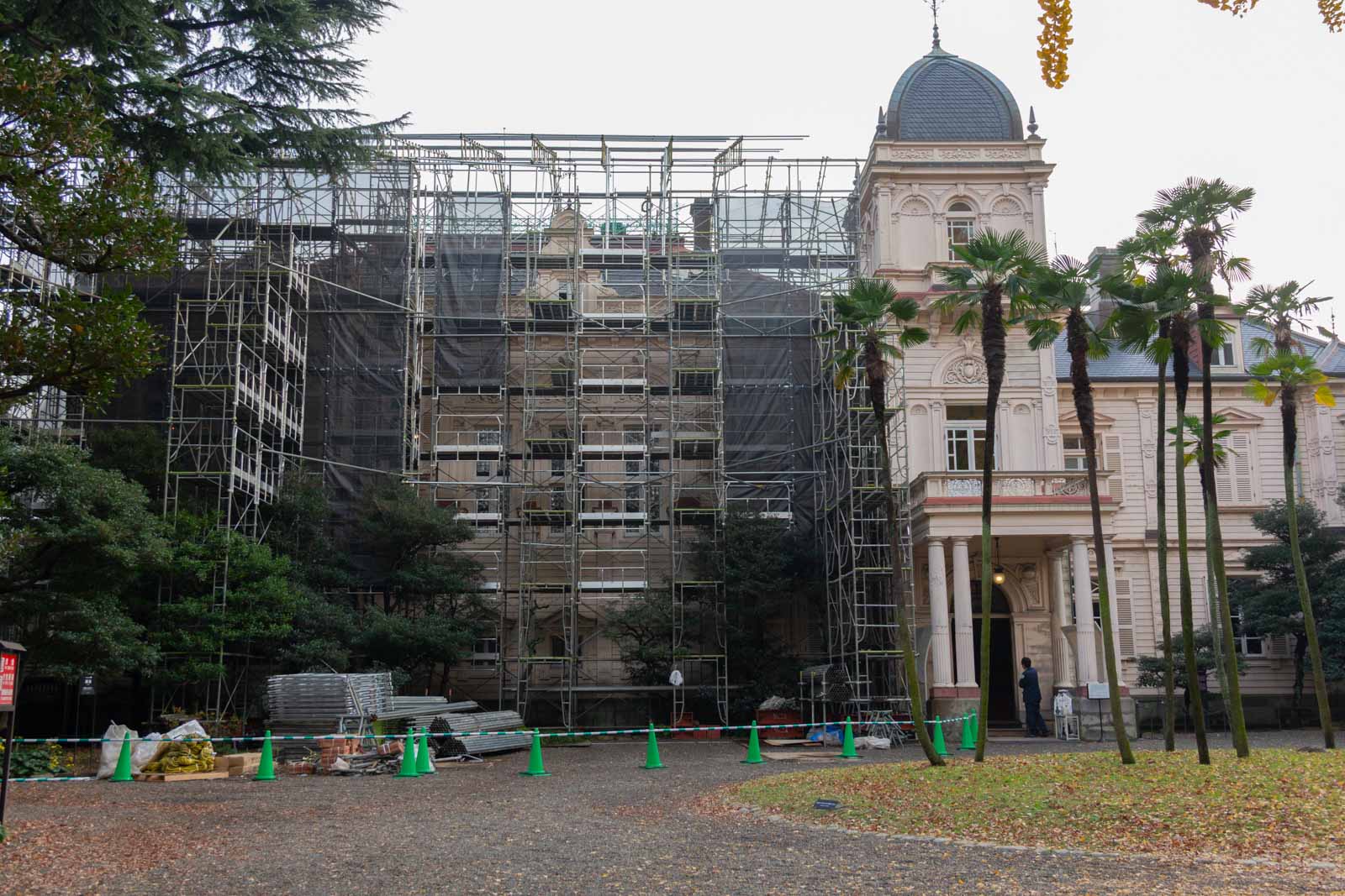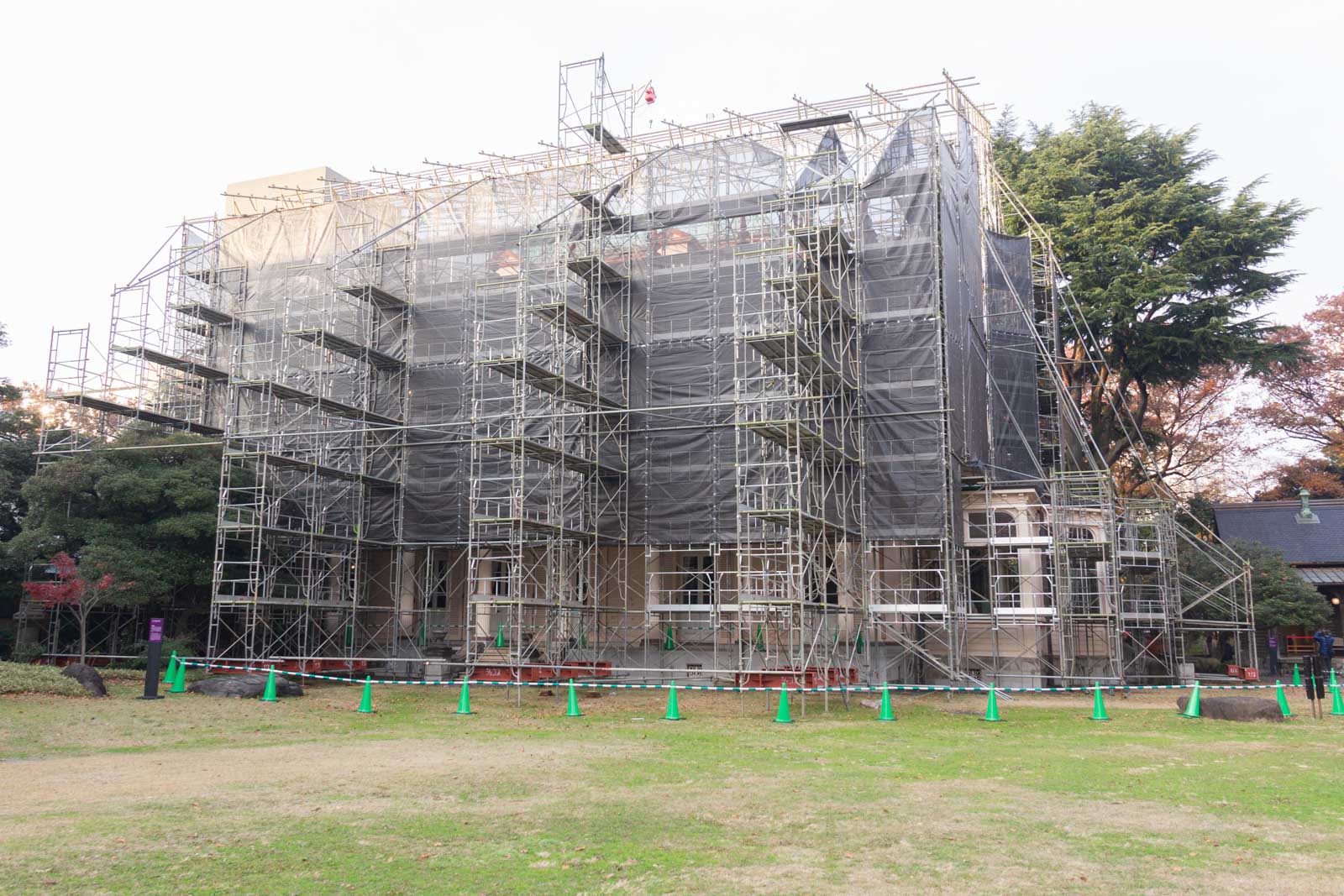 庭側にも足場が組まれており、建物全体が改修工事中のようでした。普段とは違う姿を見ることができて、新鮮な印象です。