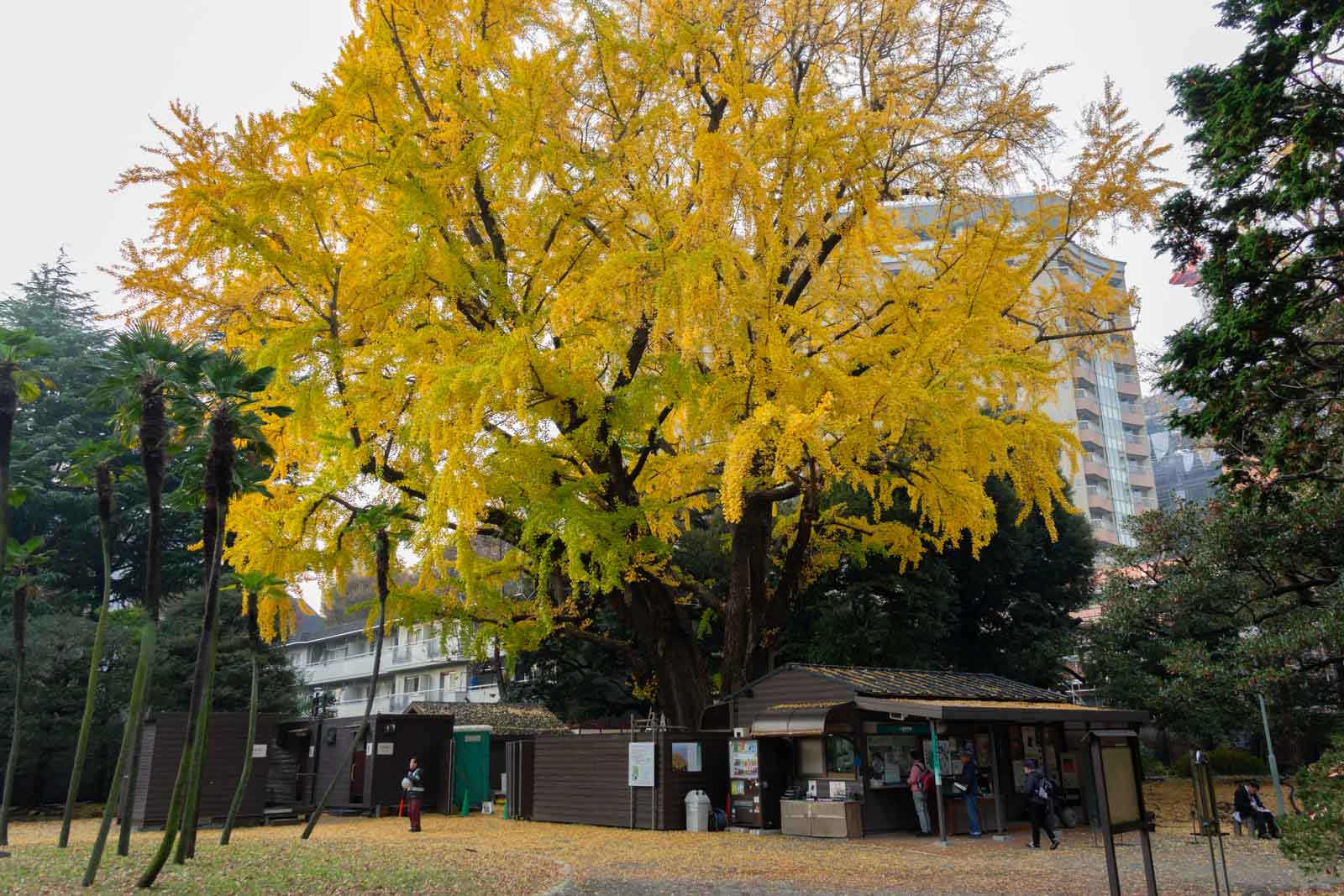 チケット売り場の後ろには、樹齢400年といわれる大きなイチョウの木があります。秋になると一面が黄金色に染まり、訪れる人をやさしく迎えてくれます。