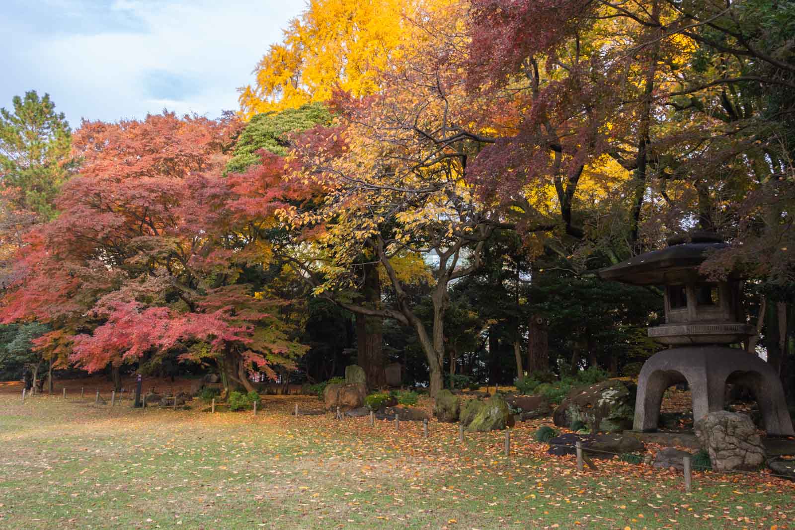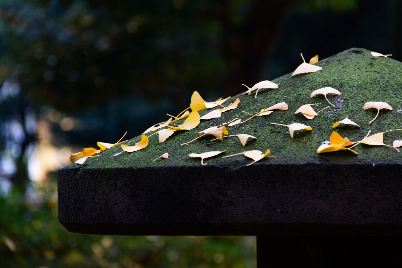 苔むした灯籠の笠の上には、イチョウの葉が静かに降り積もっていました。黄と緑の対比が美しく、時間がゆっくりと流れているように感じます。