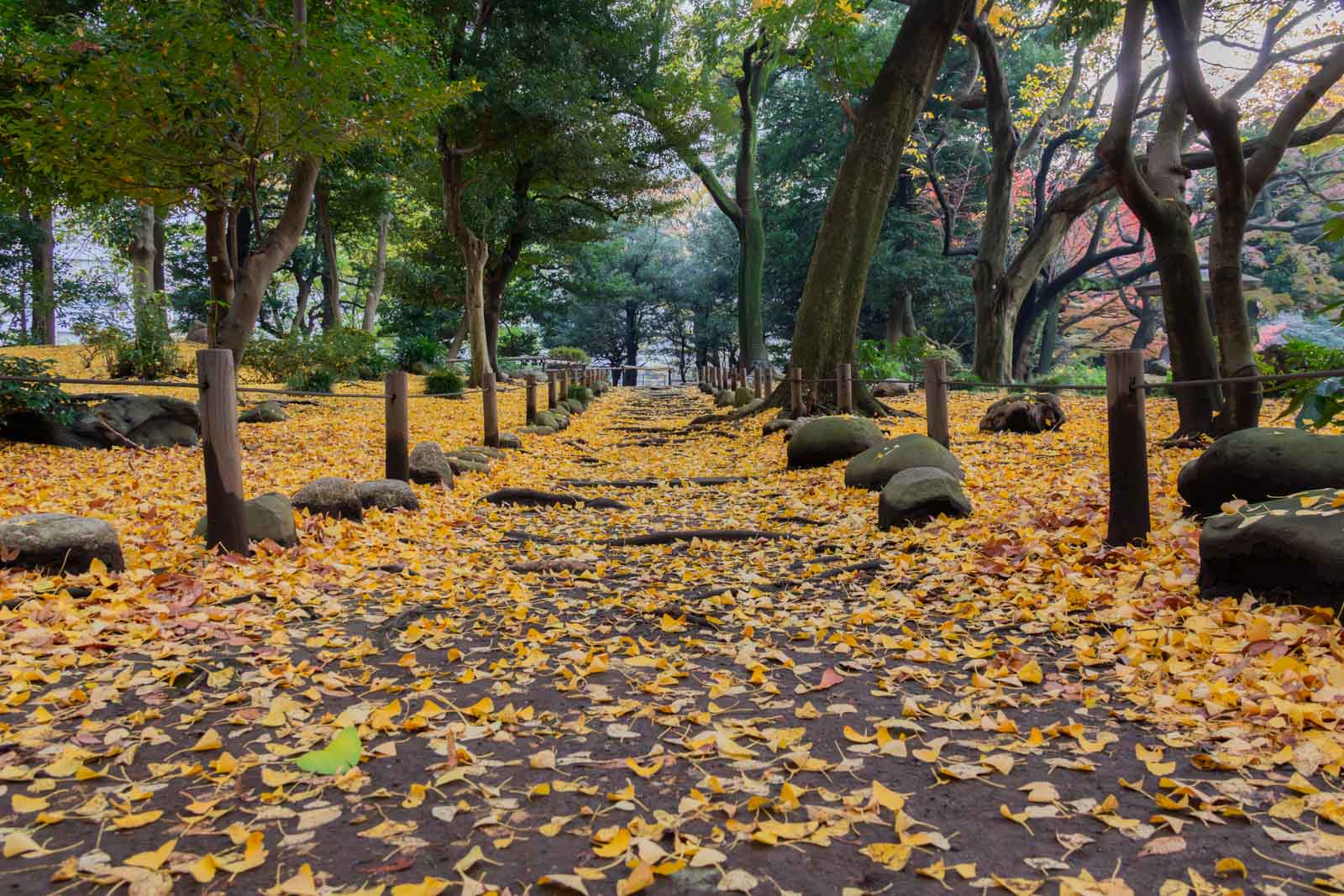 庭の奥へ進むと、足元一面にイチョウの葉が広がっていました。まるで黄金色の絨毯を歩いているようで、静かな秋の気配に包まれます。
