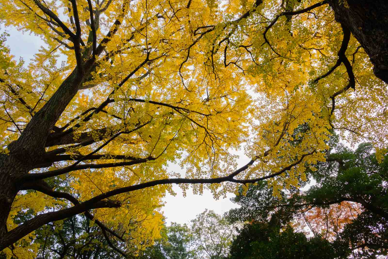見上げると、頭上いっぱいに真っ黄色の世界が広がっていました。光を通したイチョウの葉がやわらかく輝き、まるで黄金色の空の下にいるようです。