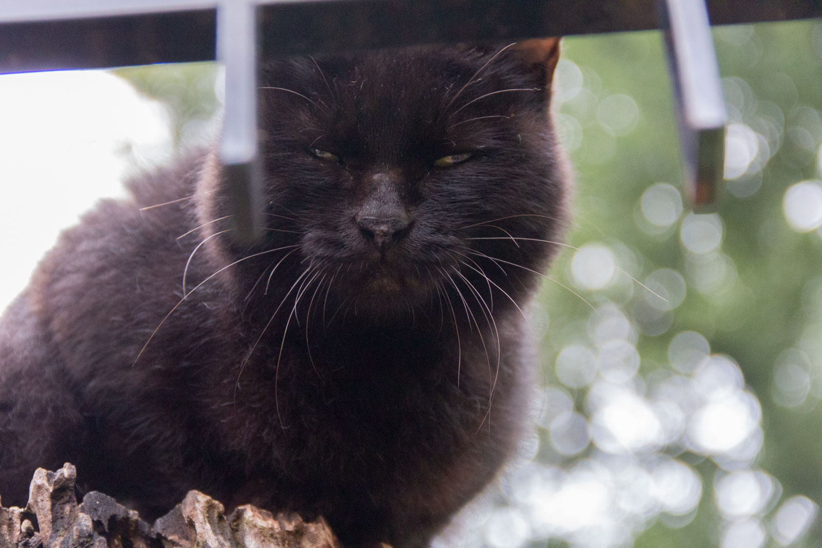 紅葉を楽しんで庭園を後にしようとしたところ、門の上から黒猫にじっと見つめられました。