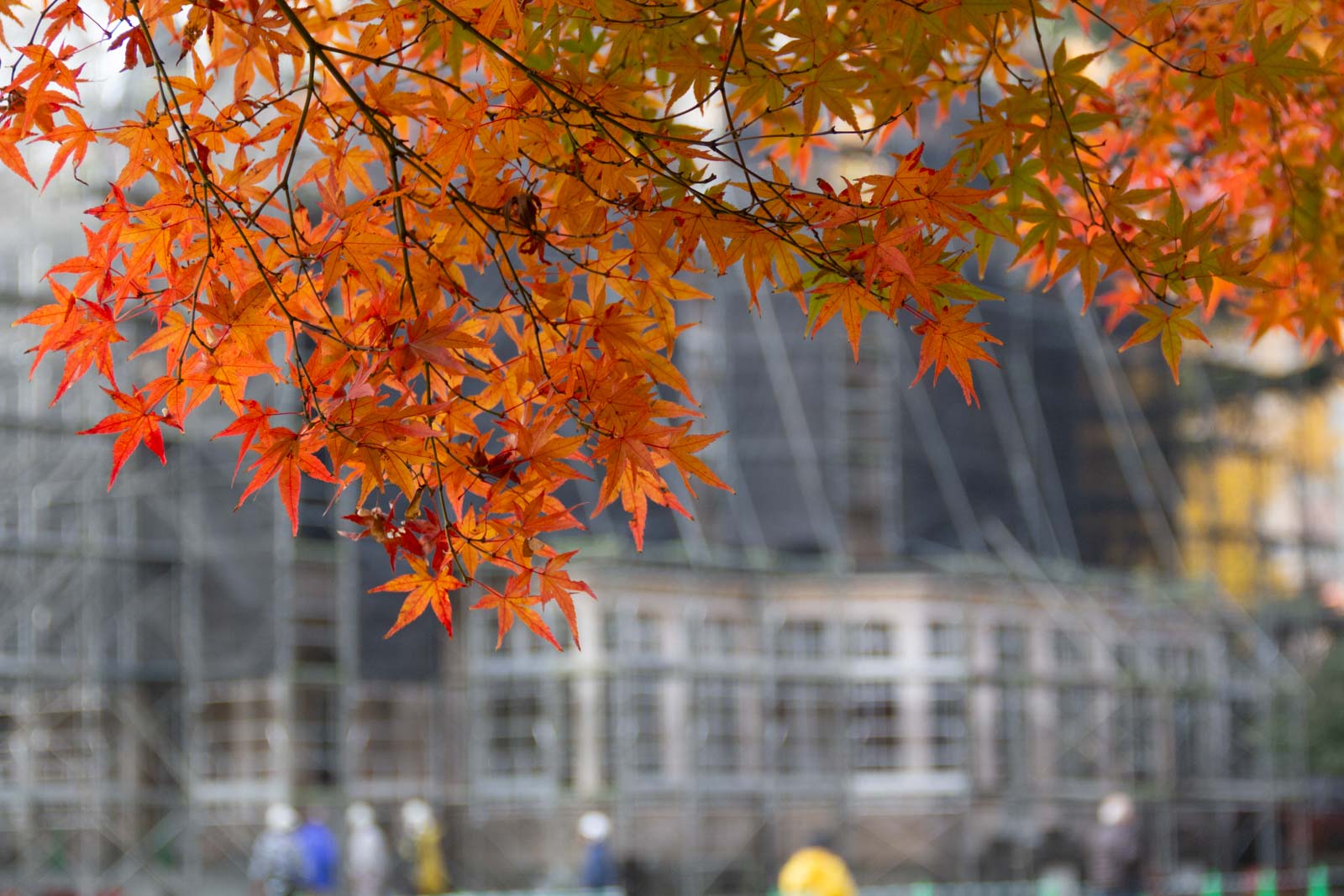 紅葉したもみじの向こうに、改修中の洋館が見えます。この組み合わせは、今の時期にしか見られない貴重な光景です。