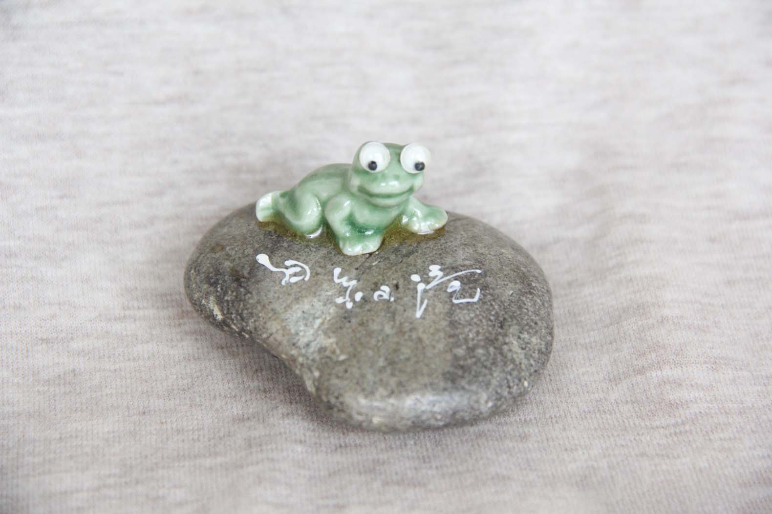 Tが社員旅行で富士に行って来た時のおみやげ。石の上のかえるの置物。