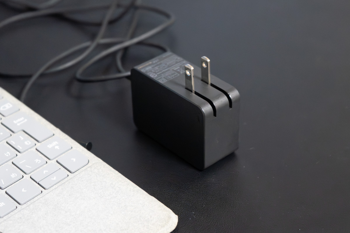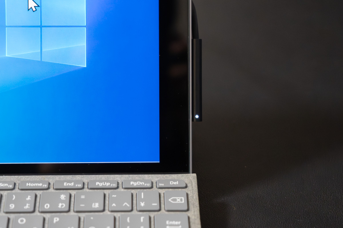Surface本体右側面に専用の充電コネクタを接続したところです。マグネットで吸着し、LEDが点灯して充電中であることがひと目で分かります。