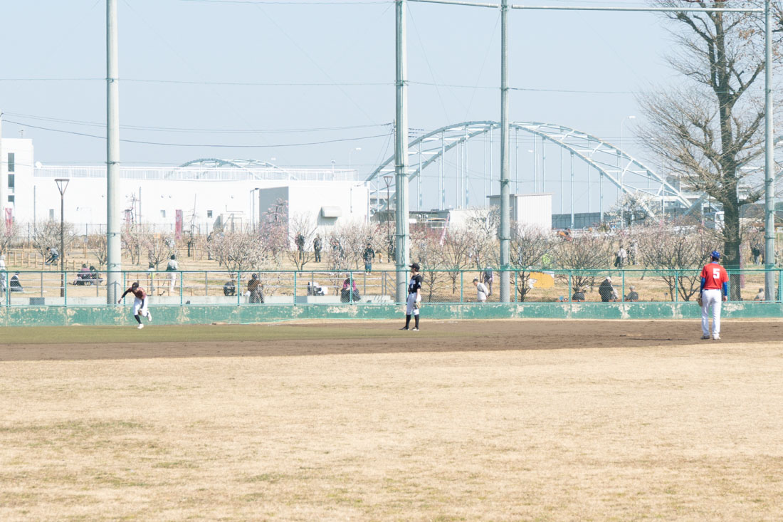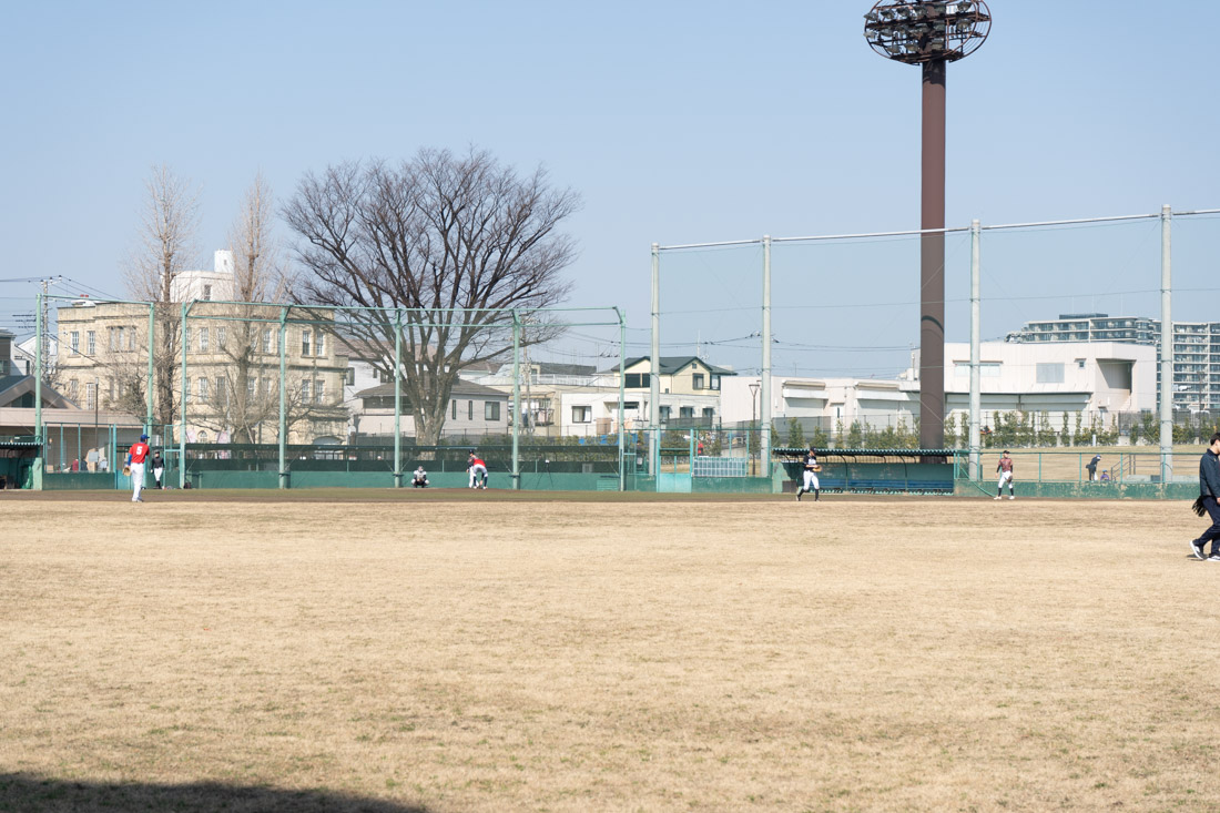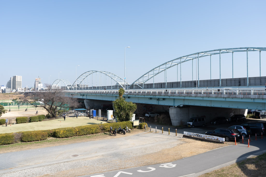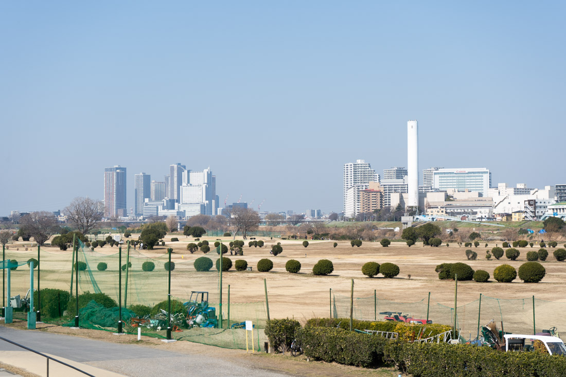 奥の左側には武蔵小杉のタワーマンションとNECのビルが見えます。右側にはキャノンのビルと多摩川清掃工場の煙突が見えます。