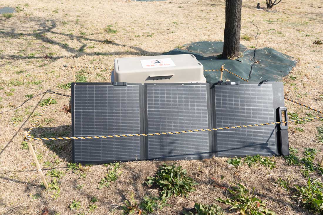 今年から?夜間のライトアップが実施されているようで、ライト用の電源と思われるソーラーパネルと充電池が設置されています。