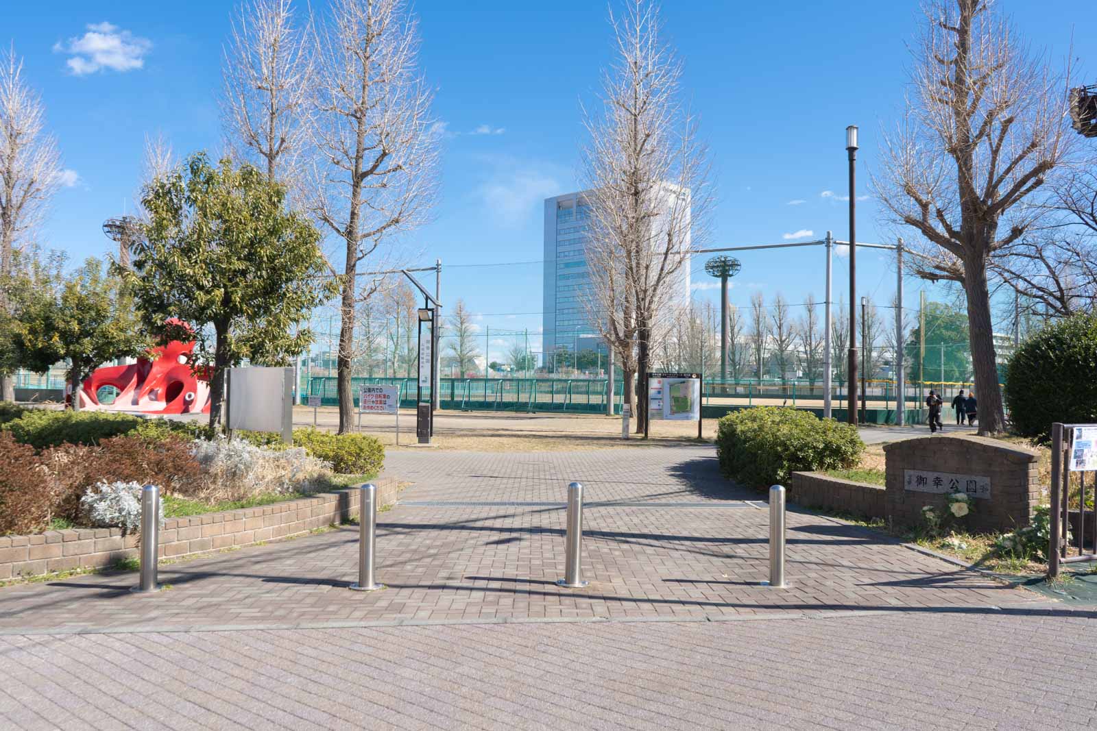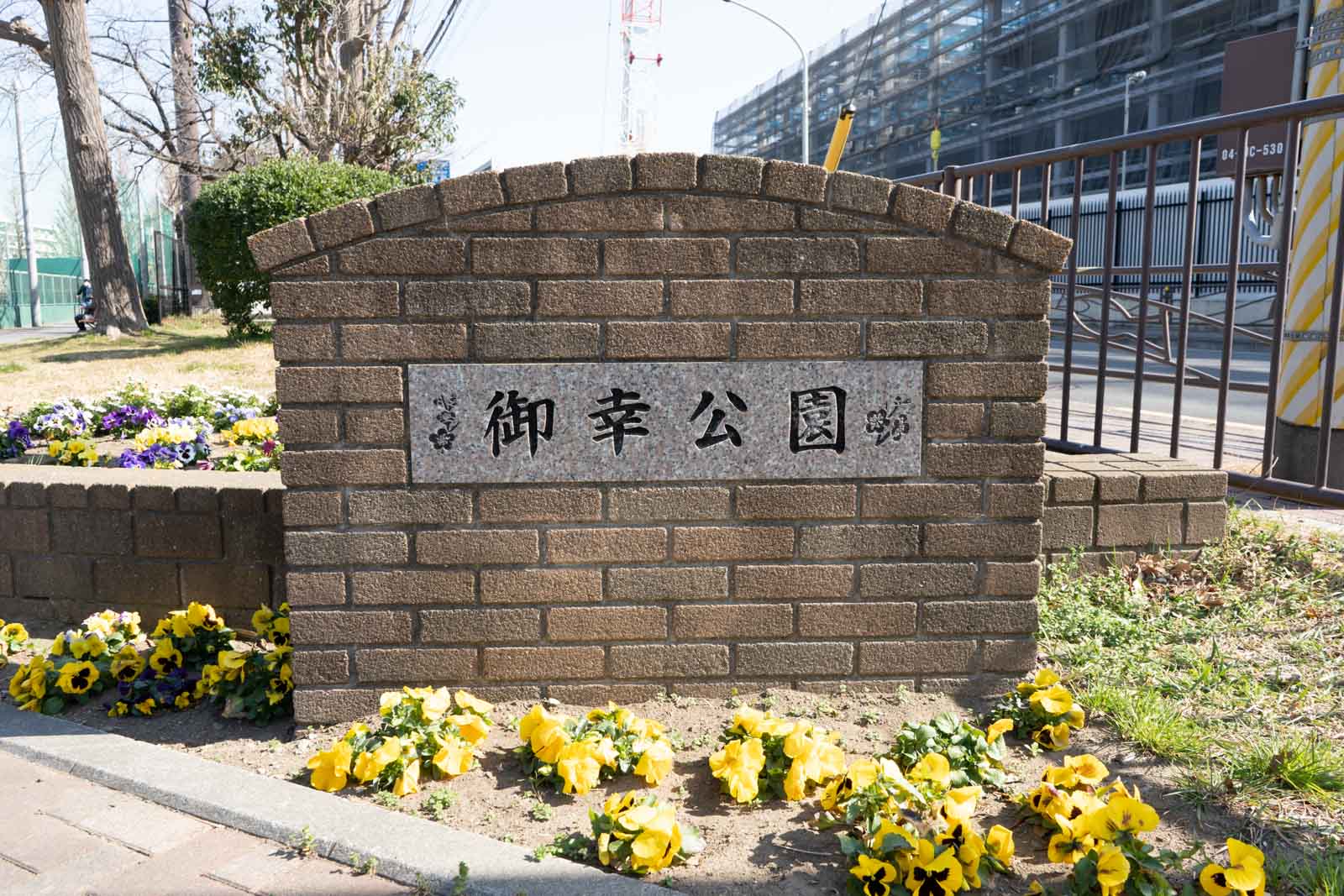 入口の右手には、レンガ造りの土台に「御幸公園」と刻まれています。