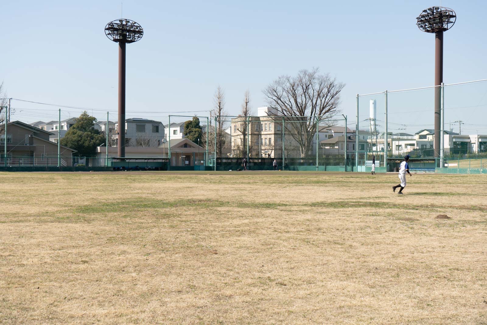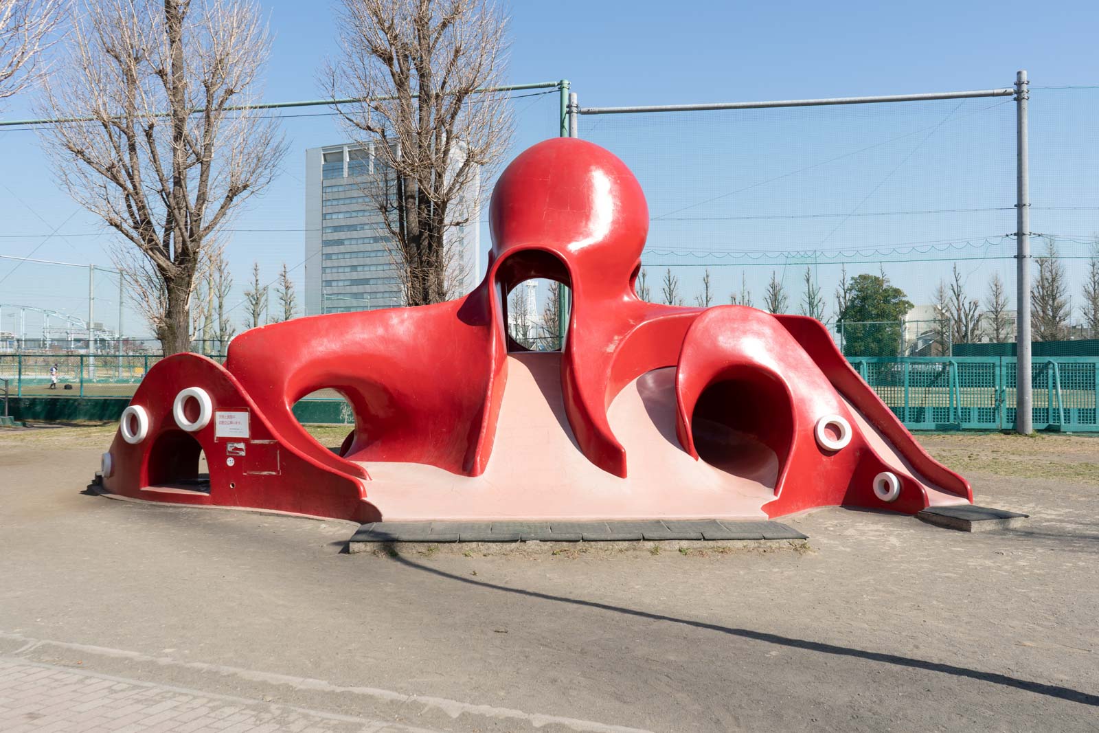 入口正面には野球場が広がり、左手には赤いタコのすべり台の遊具が見えます。