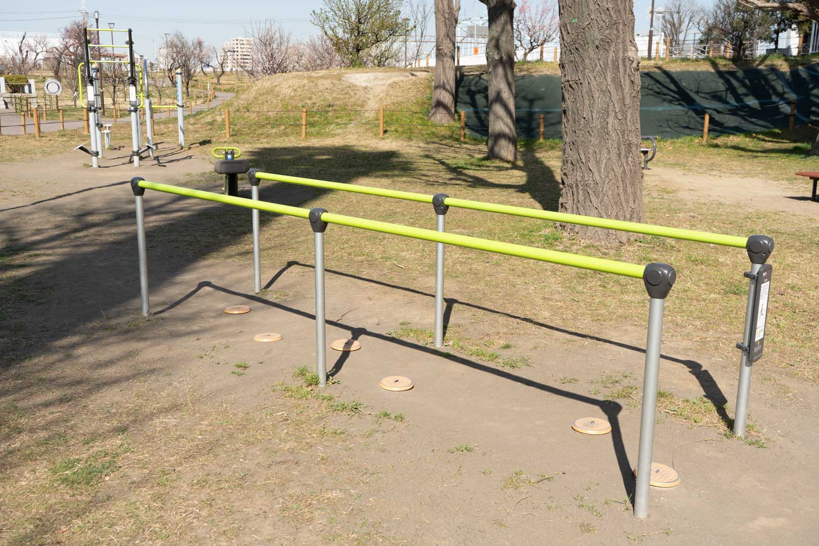 公園の開いているスペースには、さまざまな種類の健康器具が設置されています。