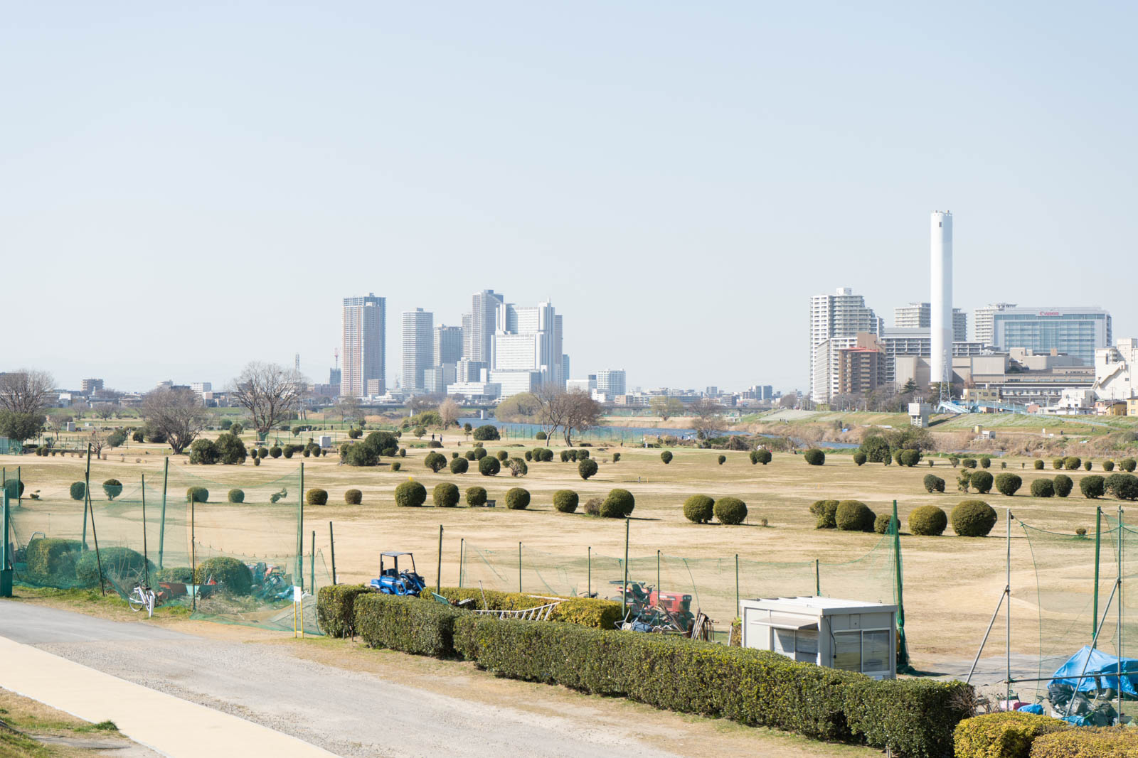 武蔵小杉のタワーマンション群をはじめ、NECのビルや玉川清掃工場の煙突、キヤノンのビルなどが見渡せます。