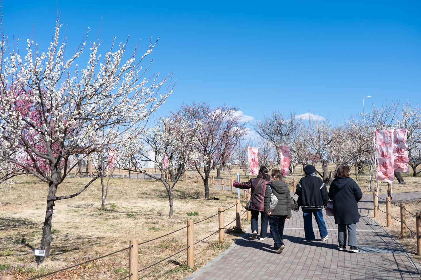 園内の遊歩道には、散歩を楽しむ人たちの姿も見られました。穏やかな日差しの中、梅の香りを感じながら歩くと、心までほぐれていくようです。