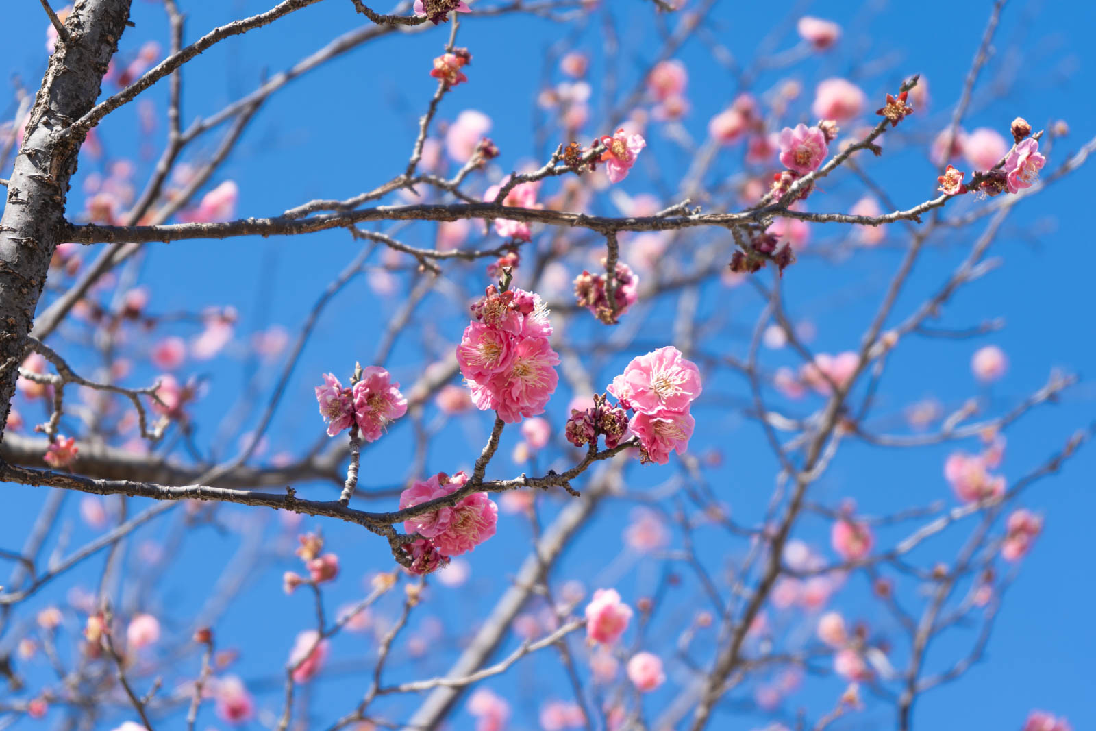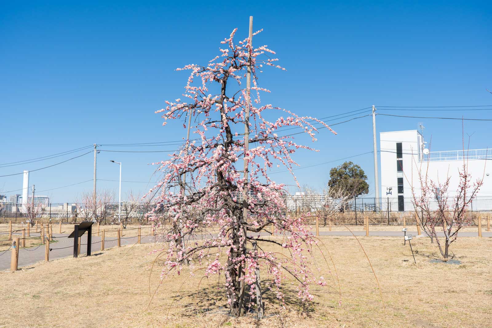 園内には、枝がしなやかに垂れたしだれ梅も植えられています。淡いピンク色の花が風に揺れ、青空とのコントラストがとても華やかでした。