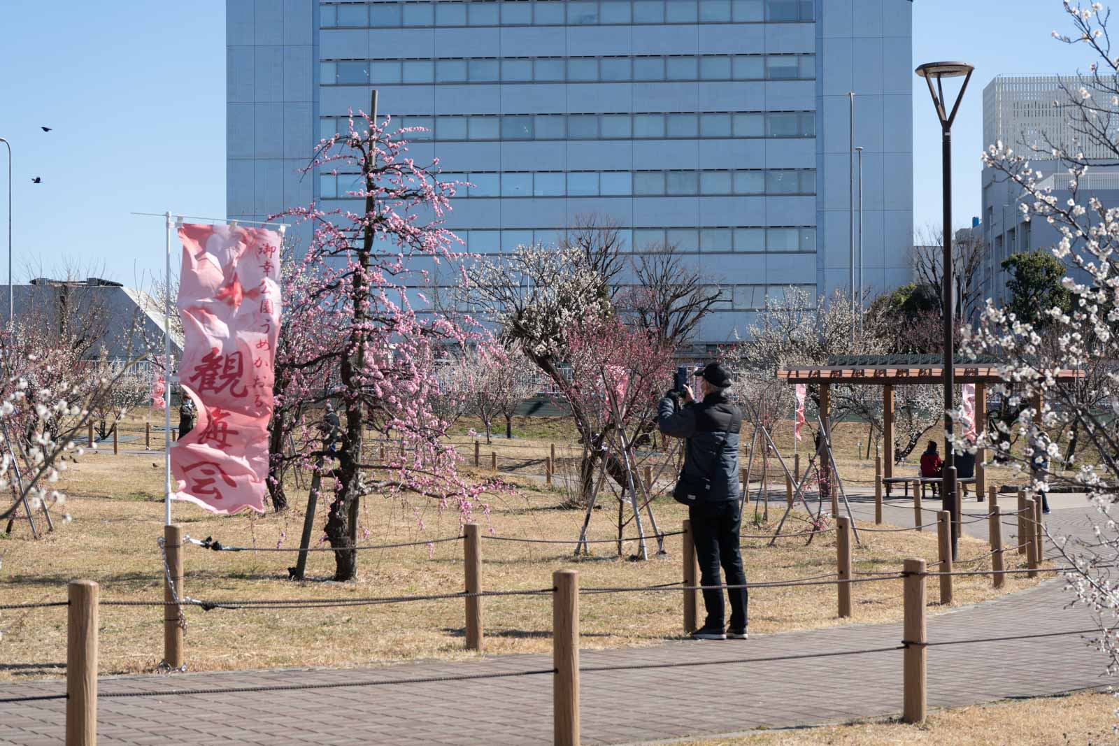園内では「観梅会」ののぼりが立ち、カメラを構える人の姿も見られました。