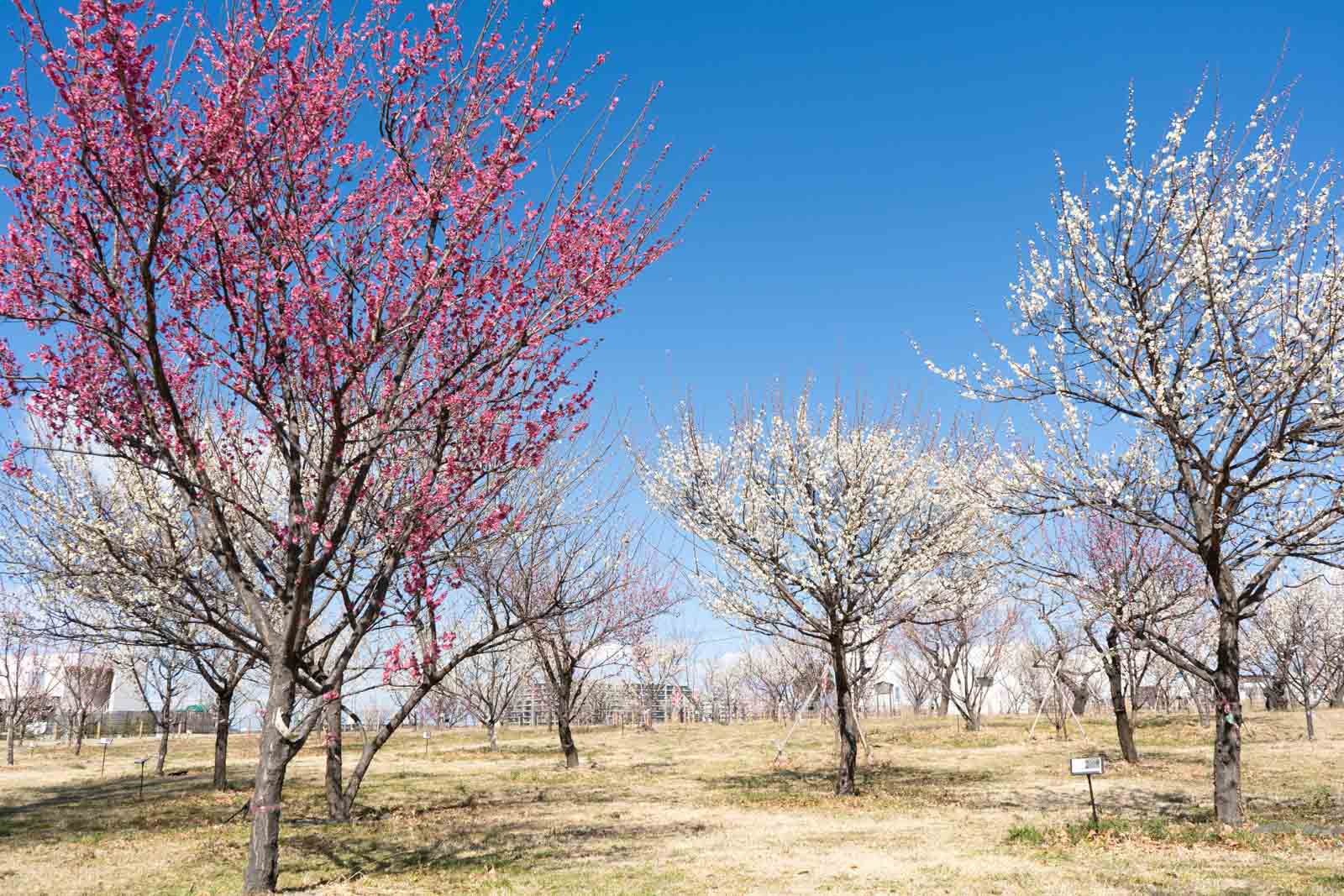梅林エリアに進むと、ピンクや白の梅の花がきれいに咲いていました。少し早めに来たようで、まだ四分咲きといったところでしょうか。