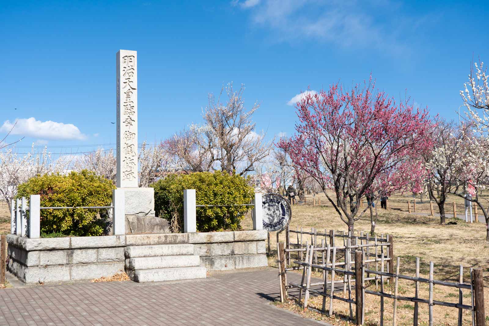 明治天皇臨幸御観梅跡の記念碑が立つ場所です。周囲には紅梅と白梅が彩りを添え、碑と花々のコントラストが印象的でした。