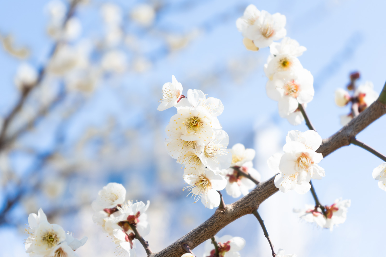 白梅の花びらが陽の光を受けて透けるように輝いています。淡い色合いとふんわりした雰囲気が、春の訪れをやさしく感じさせてくれます。