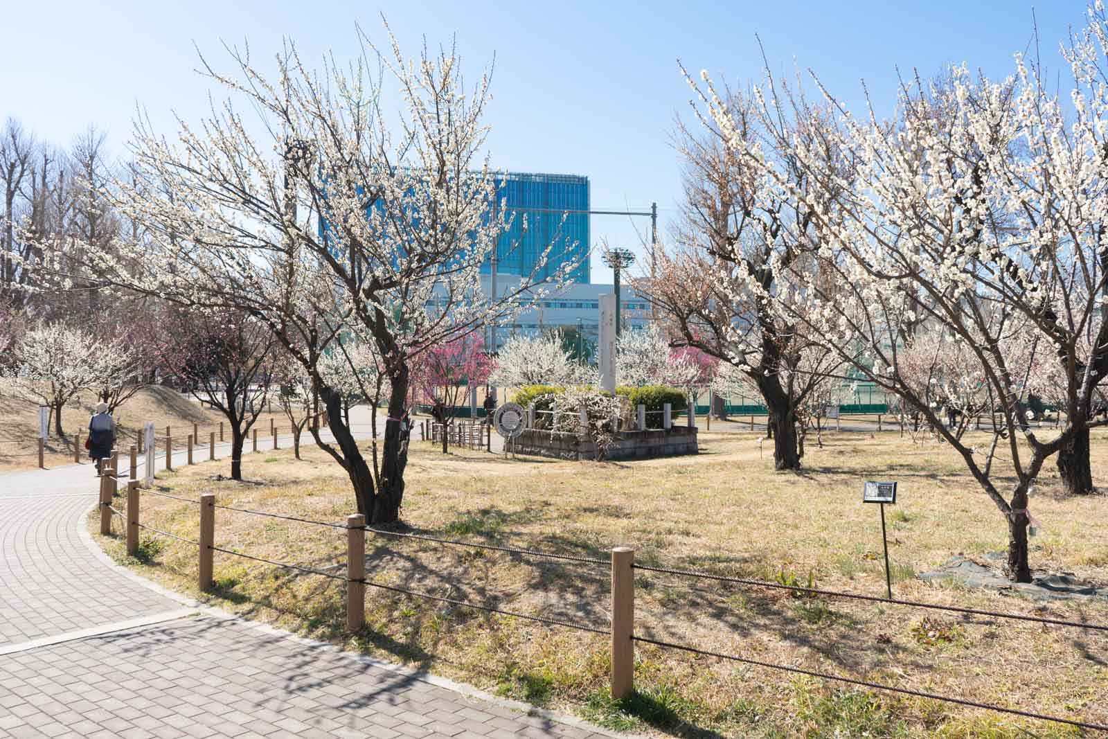 園内をゆっくり歩くと、先ほどの記念碑が梅の木々に囲まれて見えてきます。白梅・紅梅が交互に咲き、陽の光を受けて輝く様子はまるで春の絵画のようです。