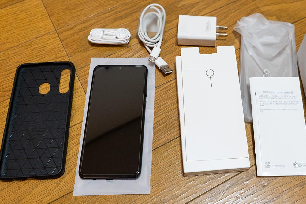 HUAWEI P30 Liteの同梱物を並べたところ。スマホ本体のほか、イヤホン、USBケーブル、充電アダプター、SIMピン、説明書が付属しています。左側のケースは別途購入しました。