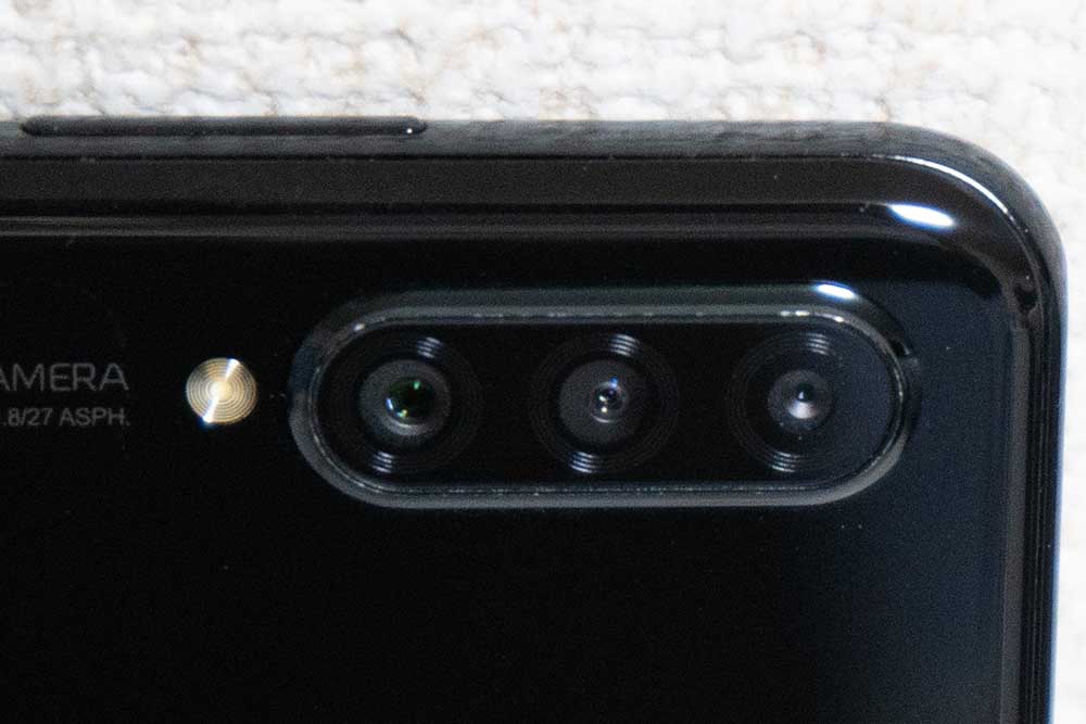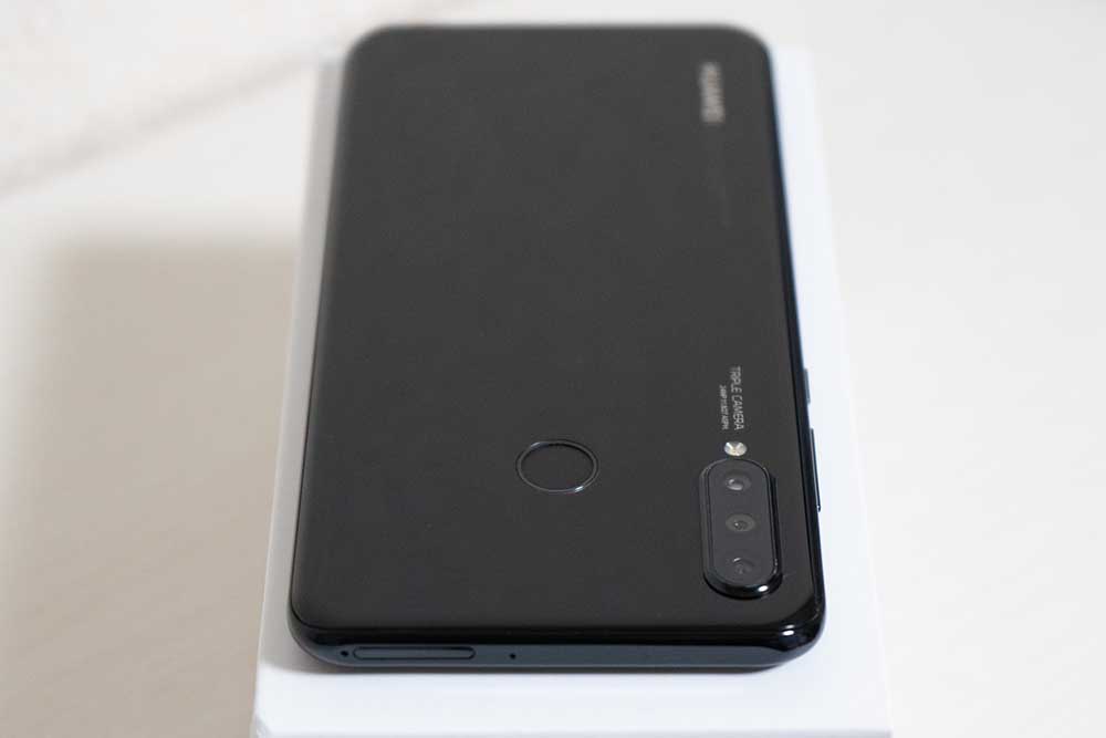 P30 Liteの背面はシンプルなブラック仕上げで、中央には指紋認証センサーを搭載しています。左上には広角レンズを含むトリプルカメラが縦に配置され、薄型ボディながらしっかりしたカメラ構成になっています。