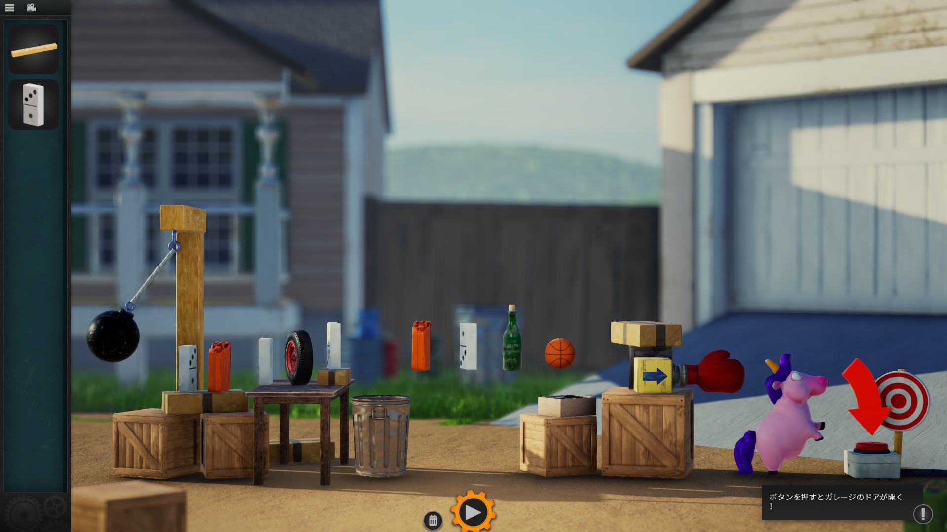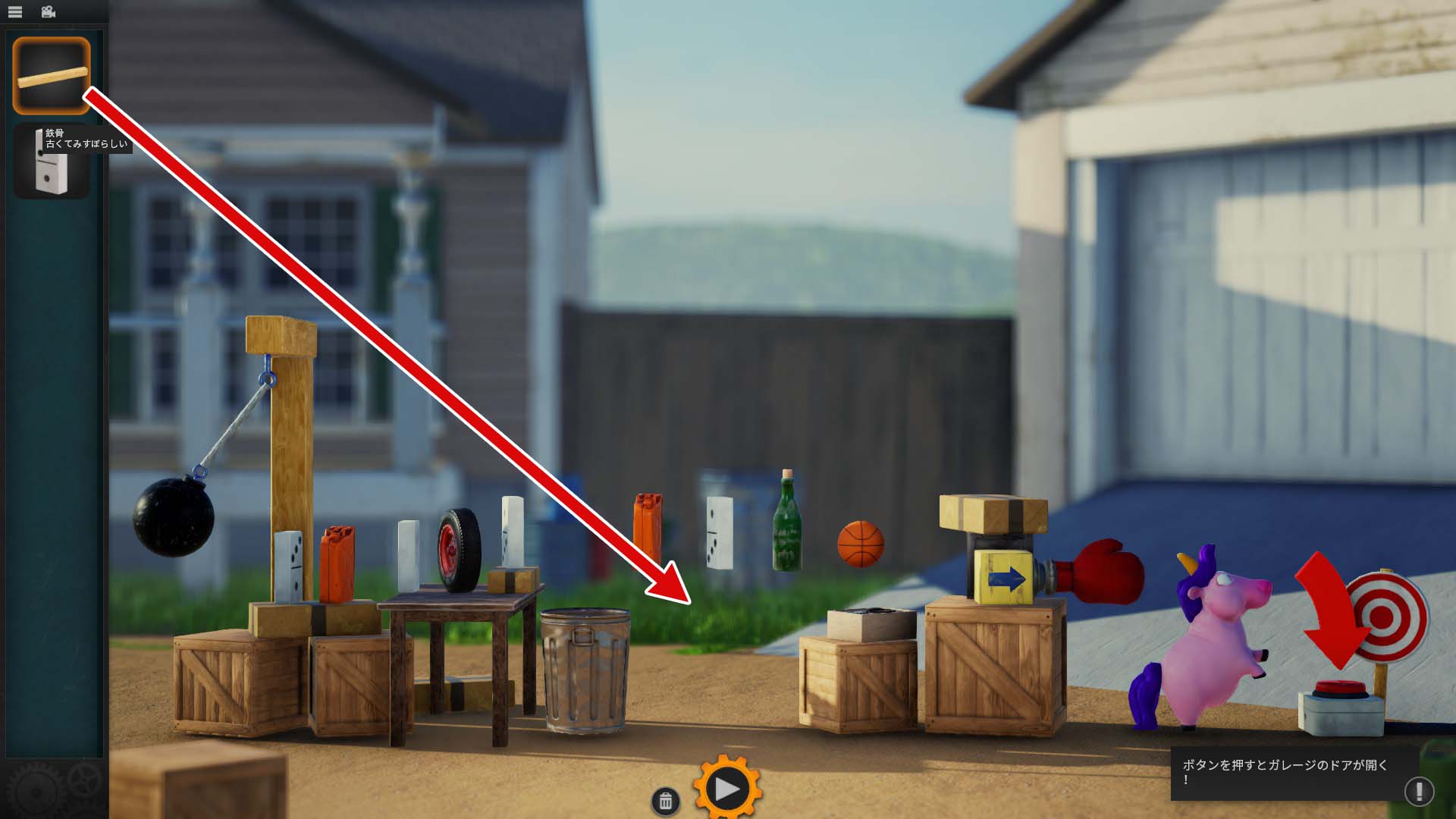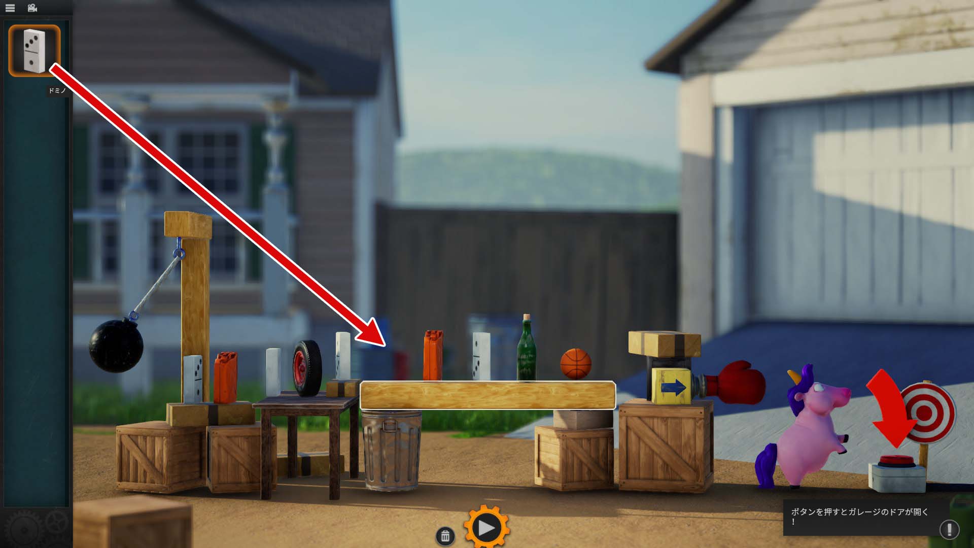 左側の鉄球が動き出すと、その勢いを利用して右端の赤いボタンを押す仕掛けを組み立てるステージです。左側にある「木材やドミノ」を組み合わせて、ボタンまで力を伝えるルートを作ります。