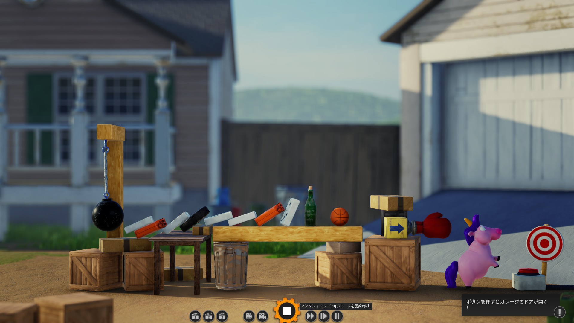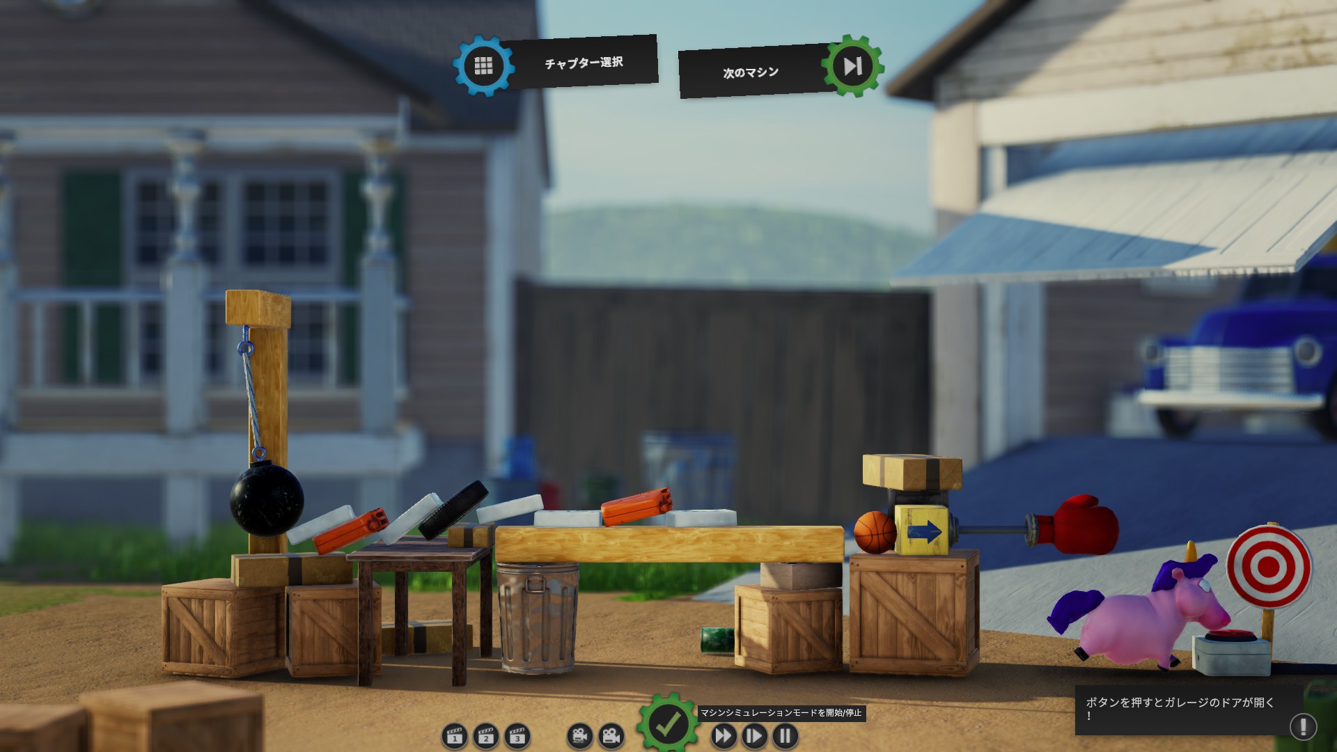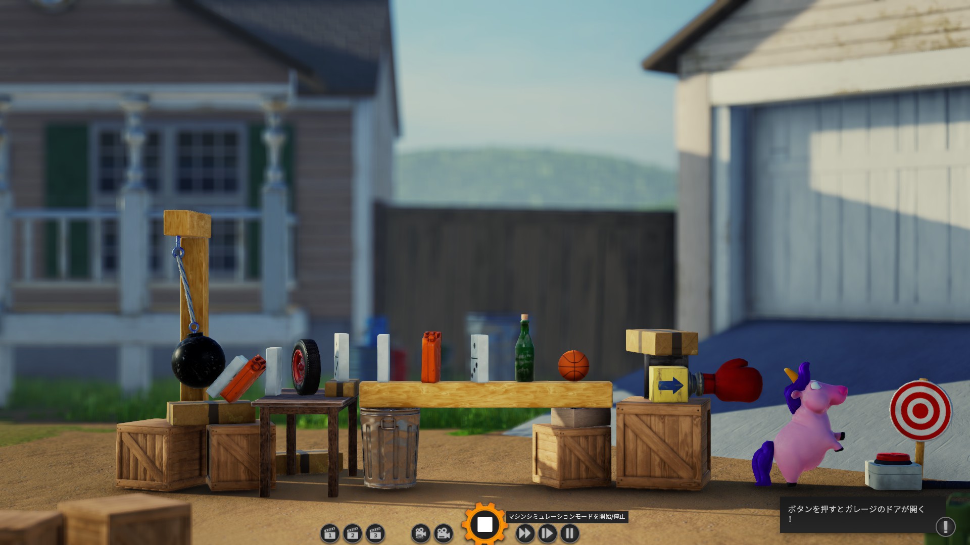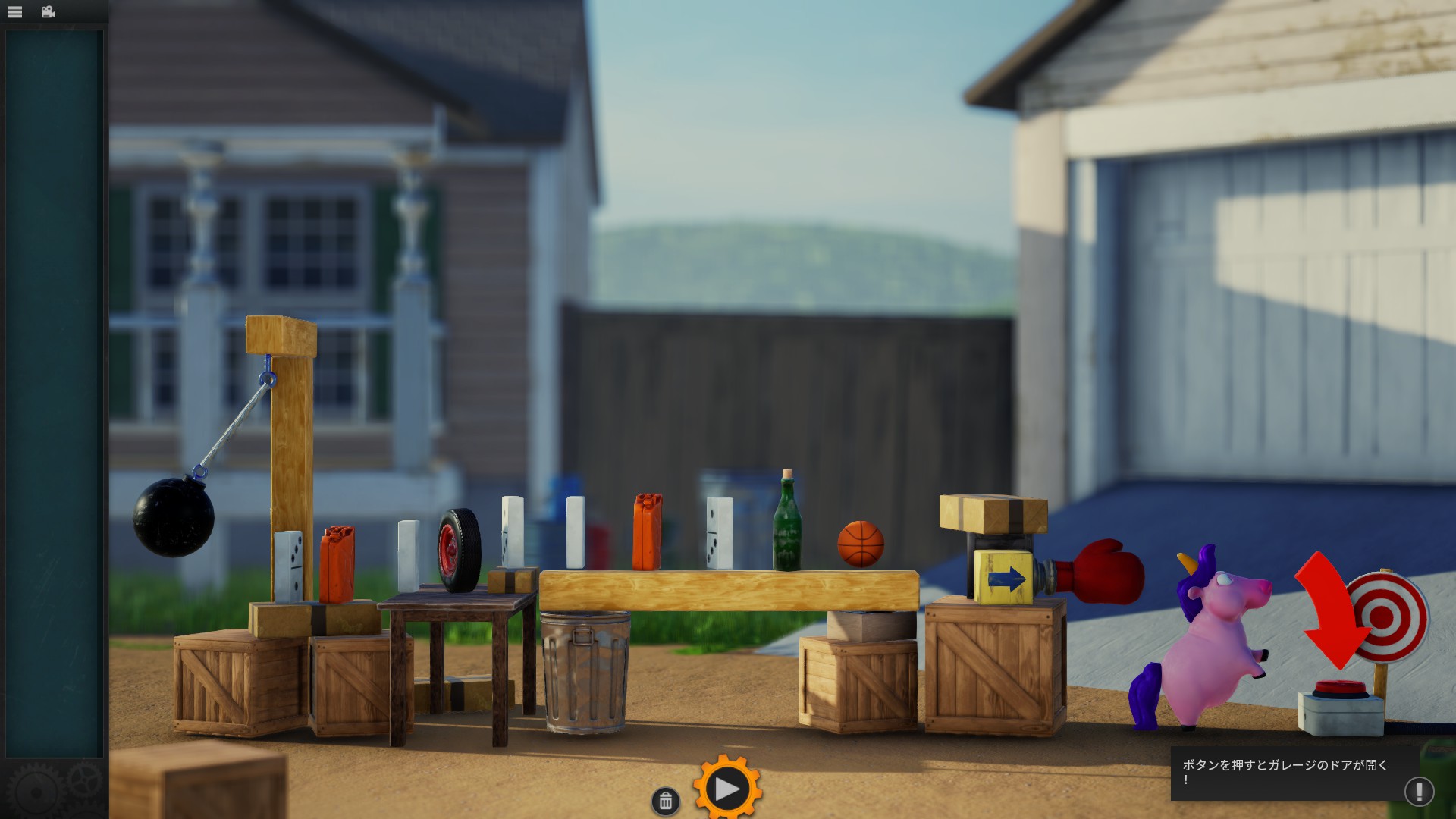左側の鉄球が動き出すと、その勢いを利用して右端の赤いボタンを押す仕掛けを組み立てるステージです。左側にある「木材やドミノ」を組み合わせて、ボタンまで力を伝えるルートを作ります。