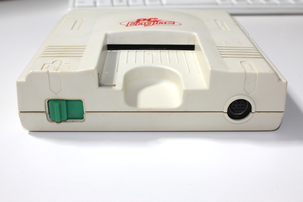 PCエンジン(PC Engine)の正面横側。左のグリーンは電源スイッチ。右側はゲームコントローラーコネクタ。