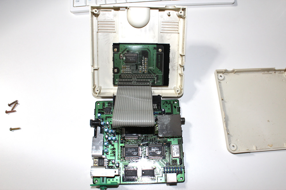 上のケースを持ち上げた状態。フラットケーブルの太さが時代を感じます。