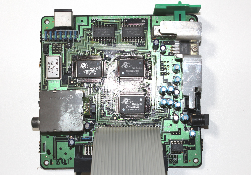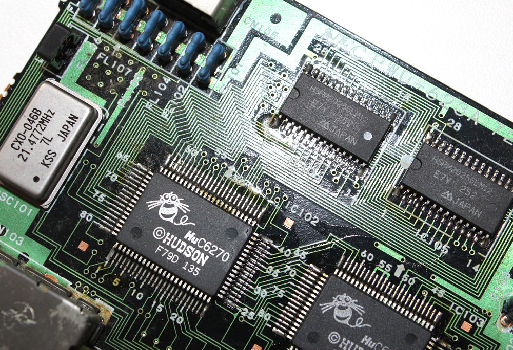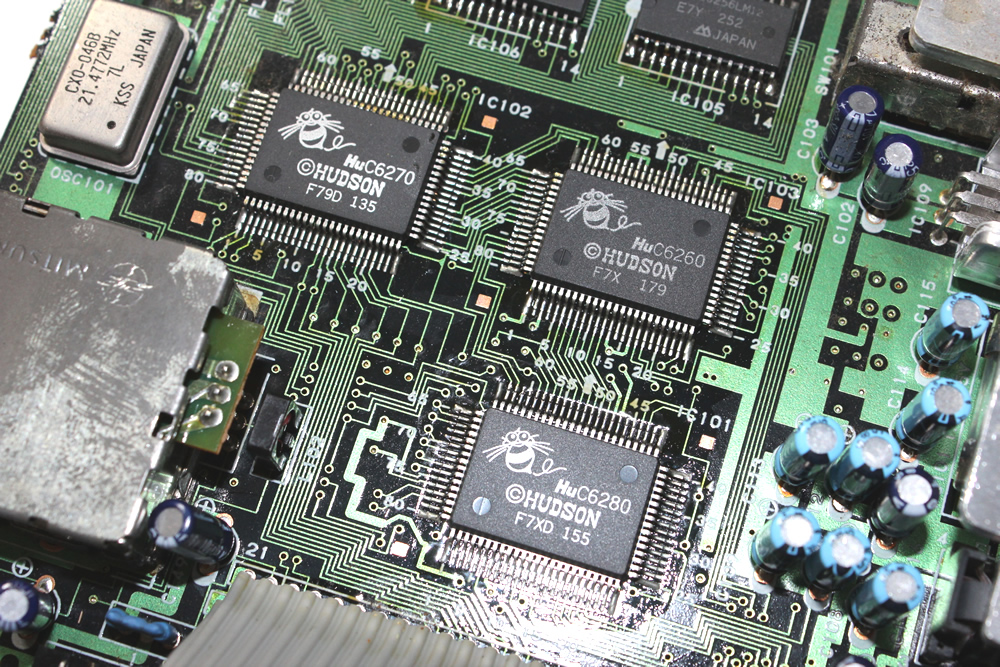 各チップの役割は、左上のHuC6270はVDC (Video Display Controller)、右上のHuC6260はVCE (Video Color Encoder)、右下のHuC6280はCPU(6502のカスタムでクロックは1.79MHz/7.16MHz)。