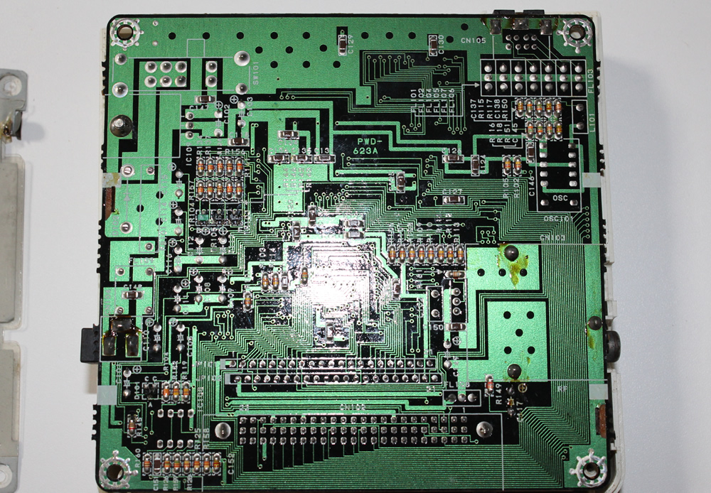 水晶振動子、CPU、GPU、上のSRAMを含めすべて日本製。因みにメモリはDRAMではなくSRAMが採用されたとのこと。サイズは8KB、VRAMは64KB。