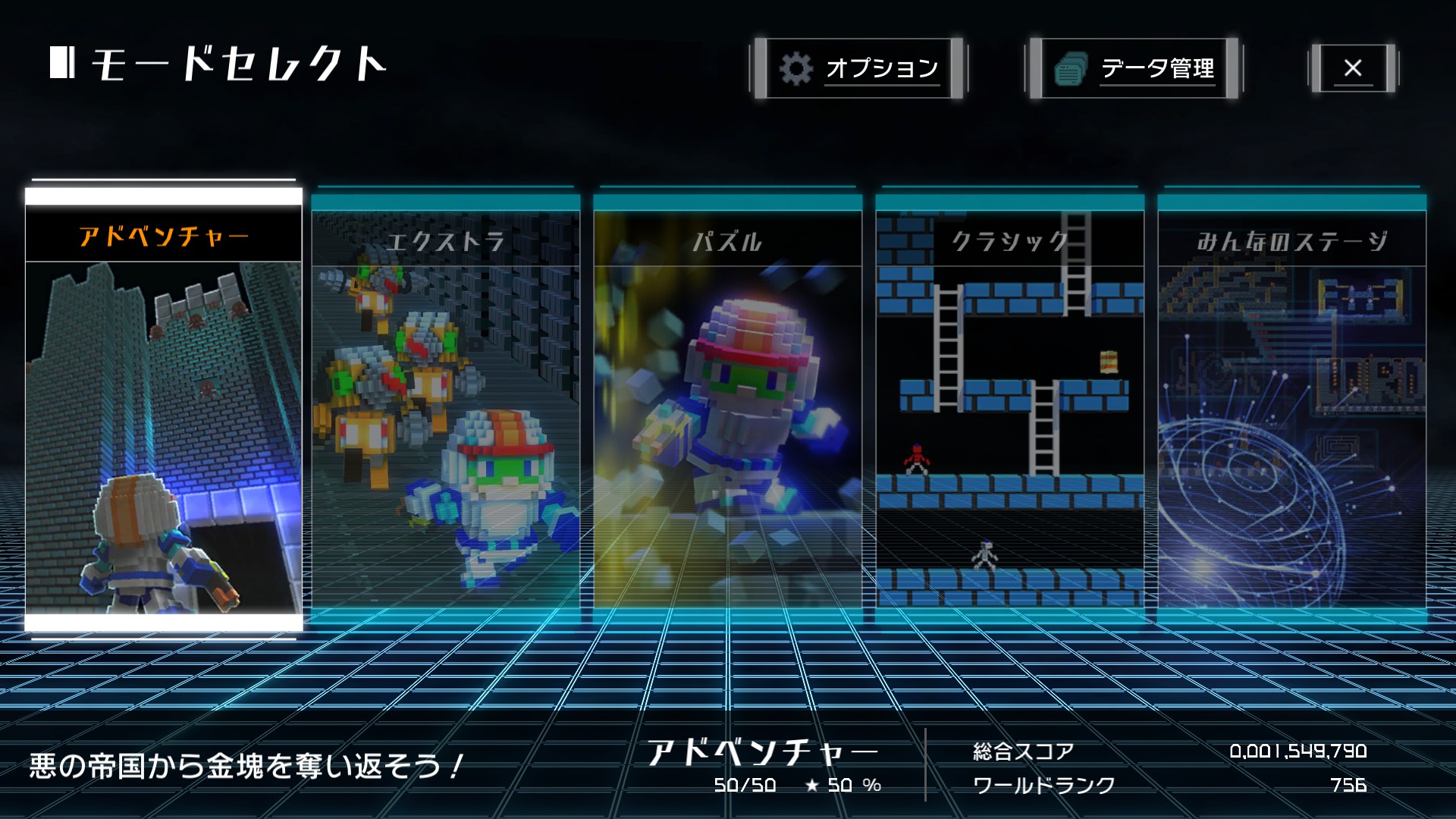 ステージはさまざまな種類が用意されており、現代風にアレンジされた「アドベンチャー」、当時の画面を再現した「クラシックモード」、自作ステージを公開して他のプレイヤーに遊んでもらえる「みんなのステージ」など、豊富なモードが揃っています。