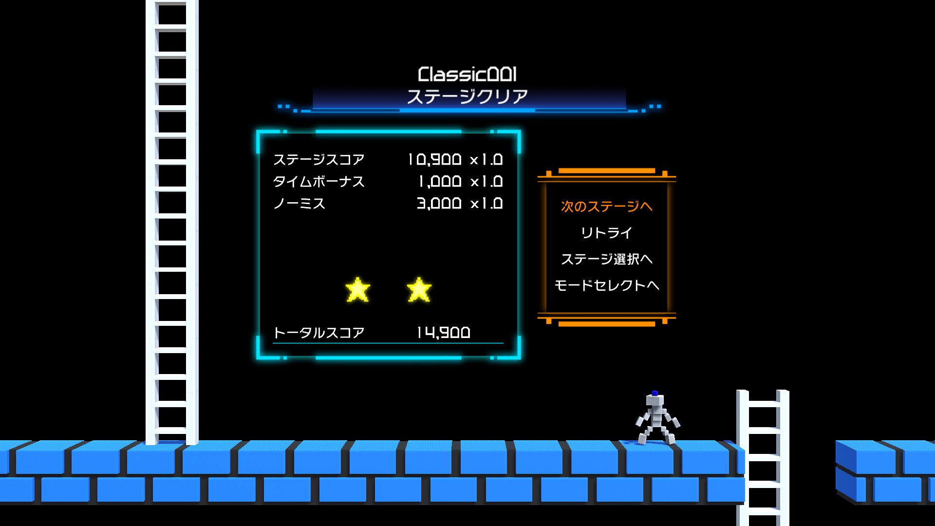 ステージをクリアすると成績が表示され、ミスの回数やクリアまでの時間に応じてスコアが加算されます。短時間でクリアしたり、ミスが少ないほど高得点になります。